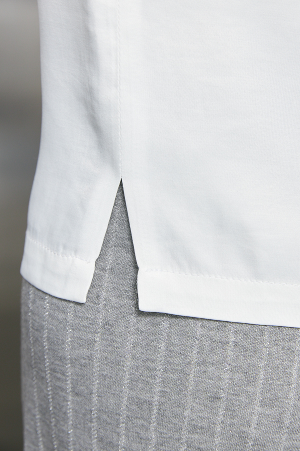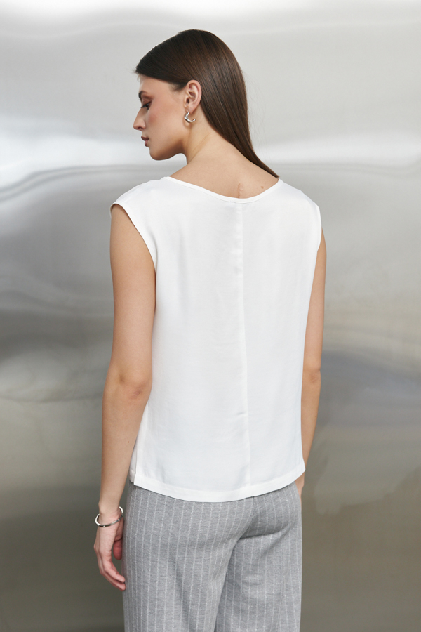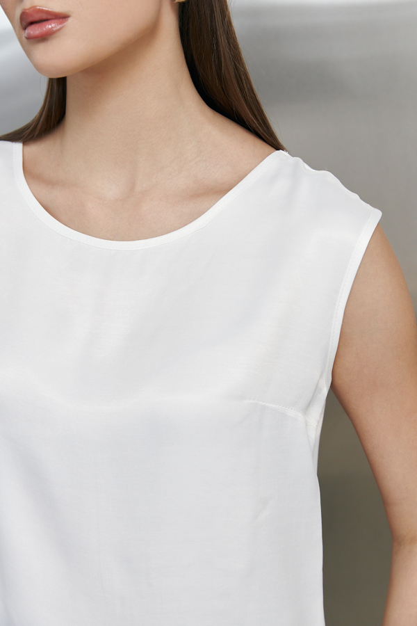 Топ из вискозной ткани с сатиновым блеском. Свободный силуэт, с небольшими разрезами в боковых швах. Круглый вырез горловины и линии проймы окантованы косыми бейками из основной ткани.