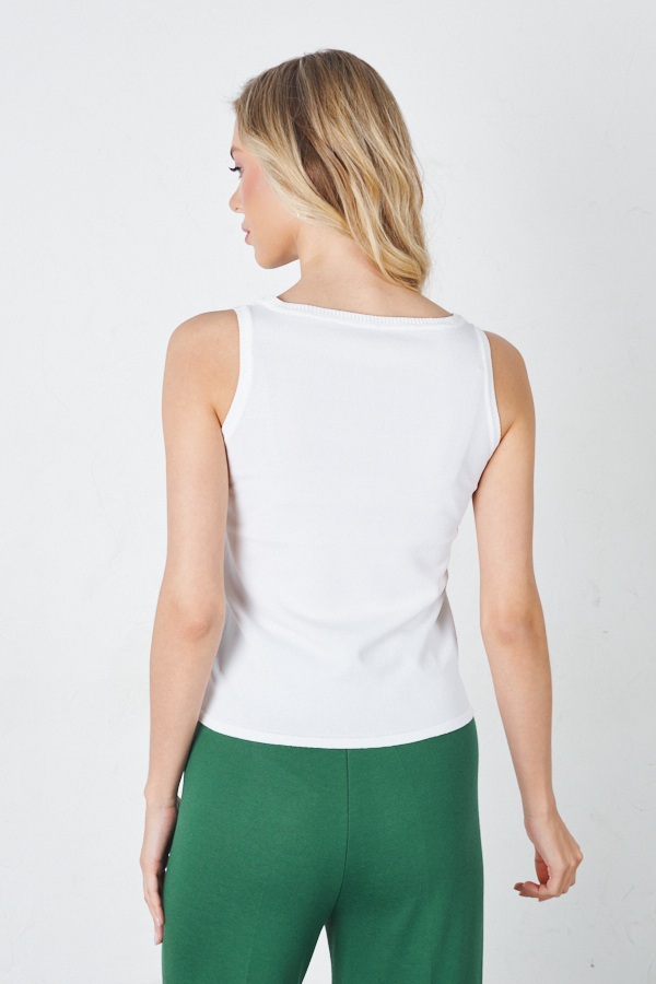 Топ на лямках прилегающего силуэта. Линия горловины и линия проймы оформлены резинкой. Изделие выполнено из мягкой вискозной пряжи.