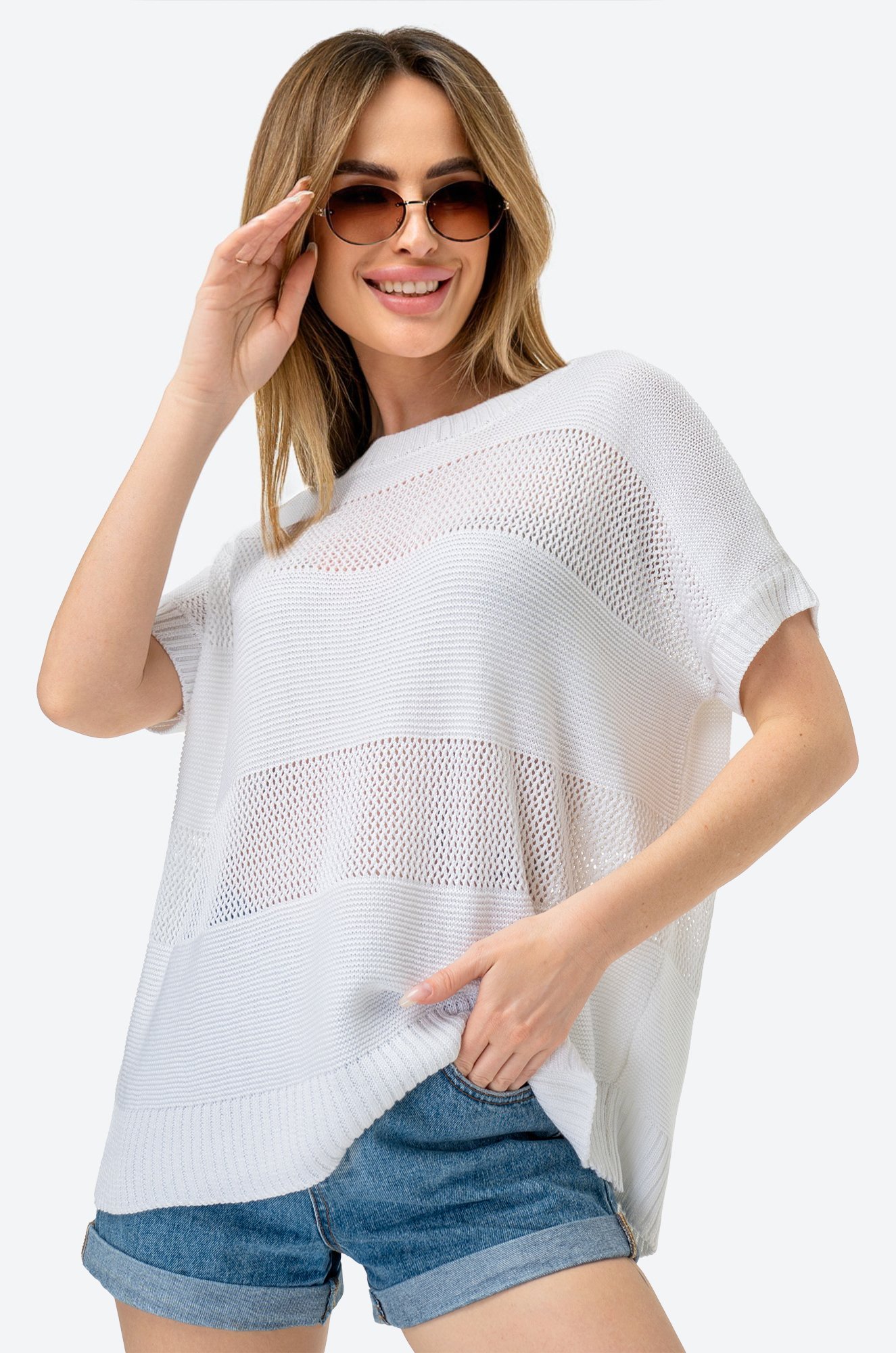Женская футболка создана для лёгкого и беззаботного лета. Полупрозрачный ажурный вязаный трикотаж с сетчатыми вставками подчёркивает расслабленное настроение.
