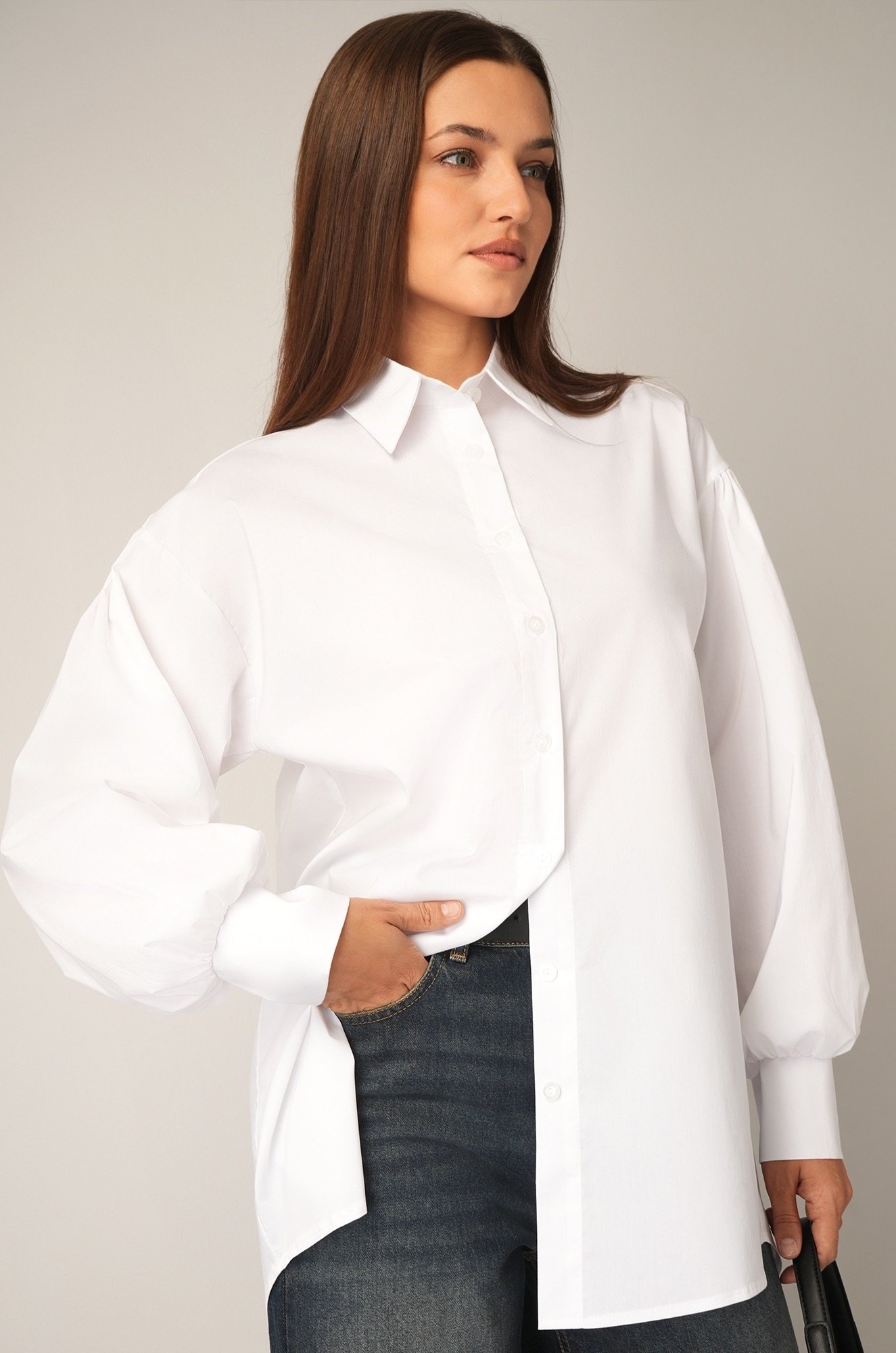 Шикарная женская рубашка оверсайз из натурального 100% хлопка станет стильной базой для любого образа. Объемные рукава-фонарики, удлиненная спинка и отложной воротник добавляют рубашке для женщин нотки нежности и романтики.