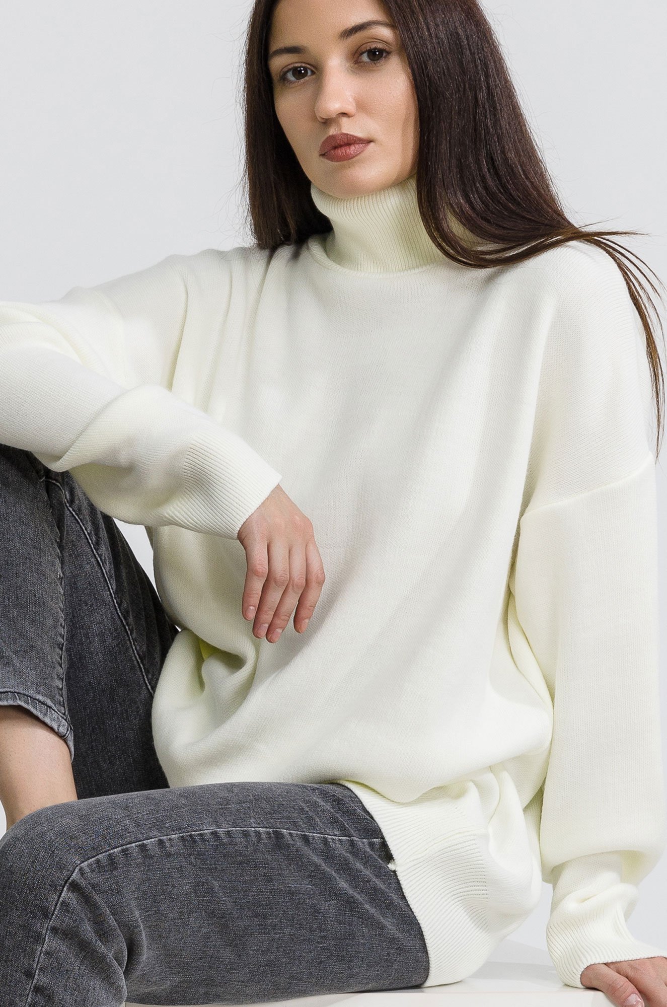 Длинный джемпер с горлом отлично впишется в повседневные осенние или зимние образы. Однотонный свитер для женщин отлично подходит для прогулок осенью, для повседневных образов в офис.