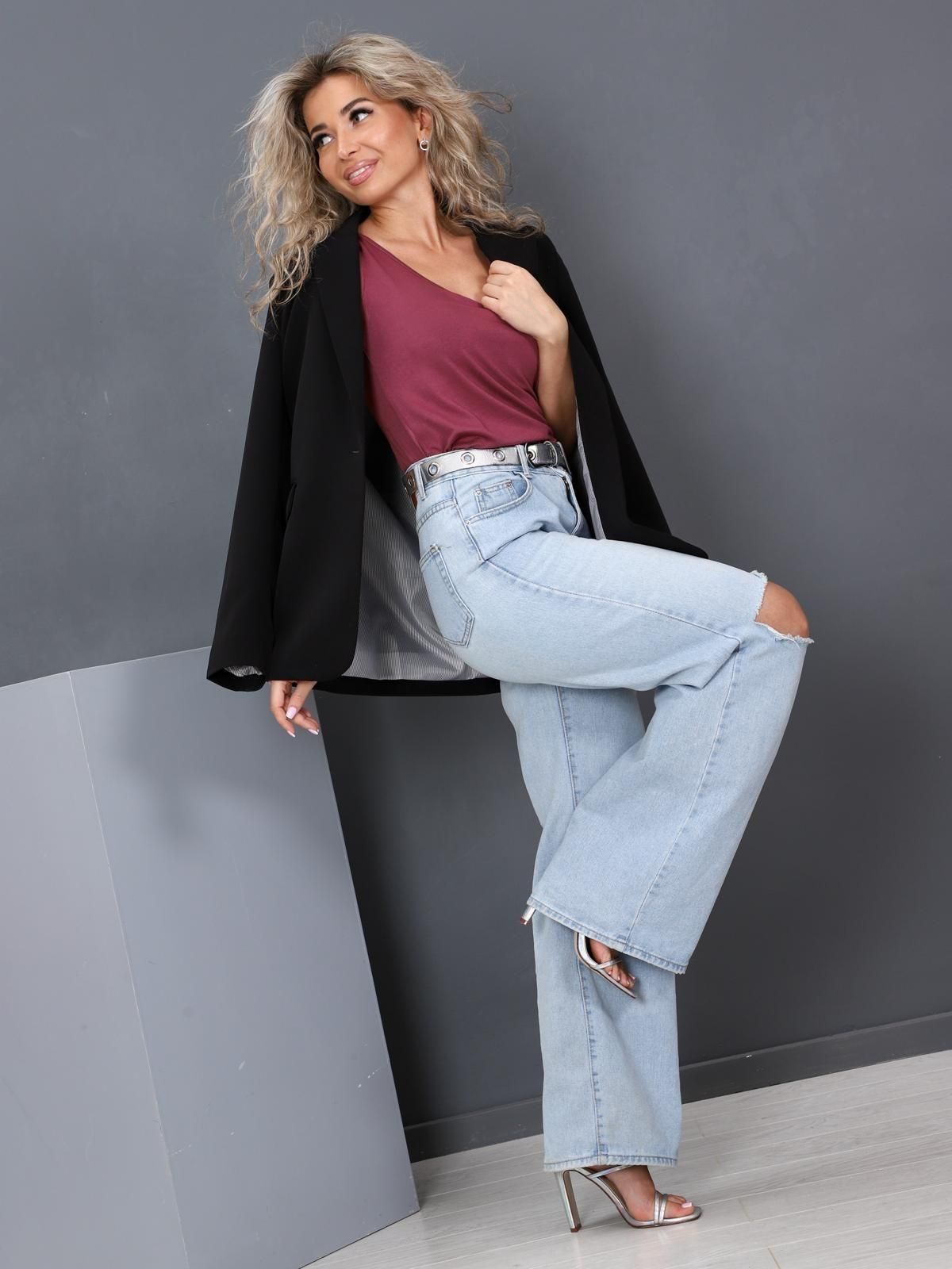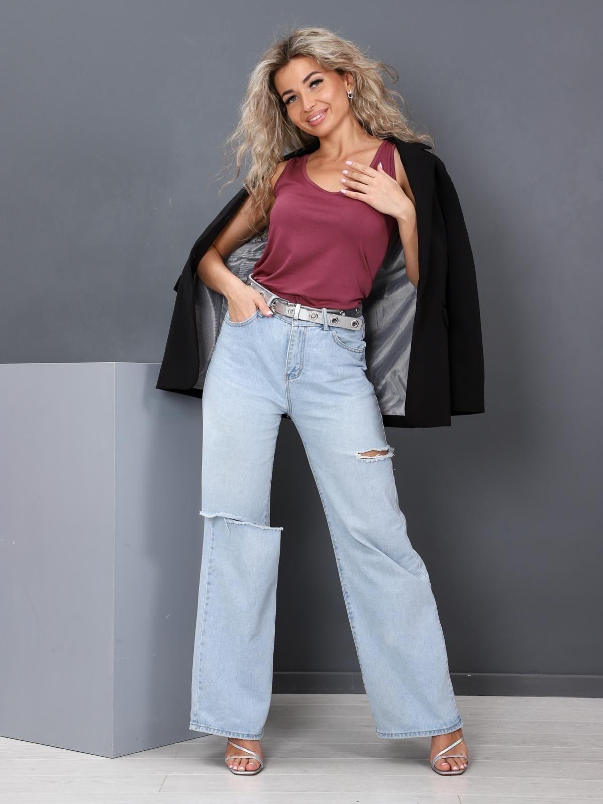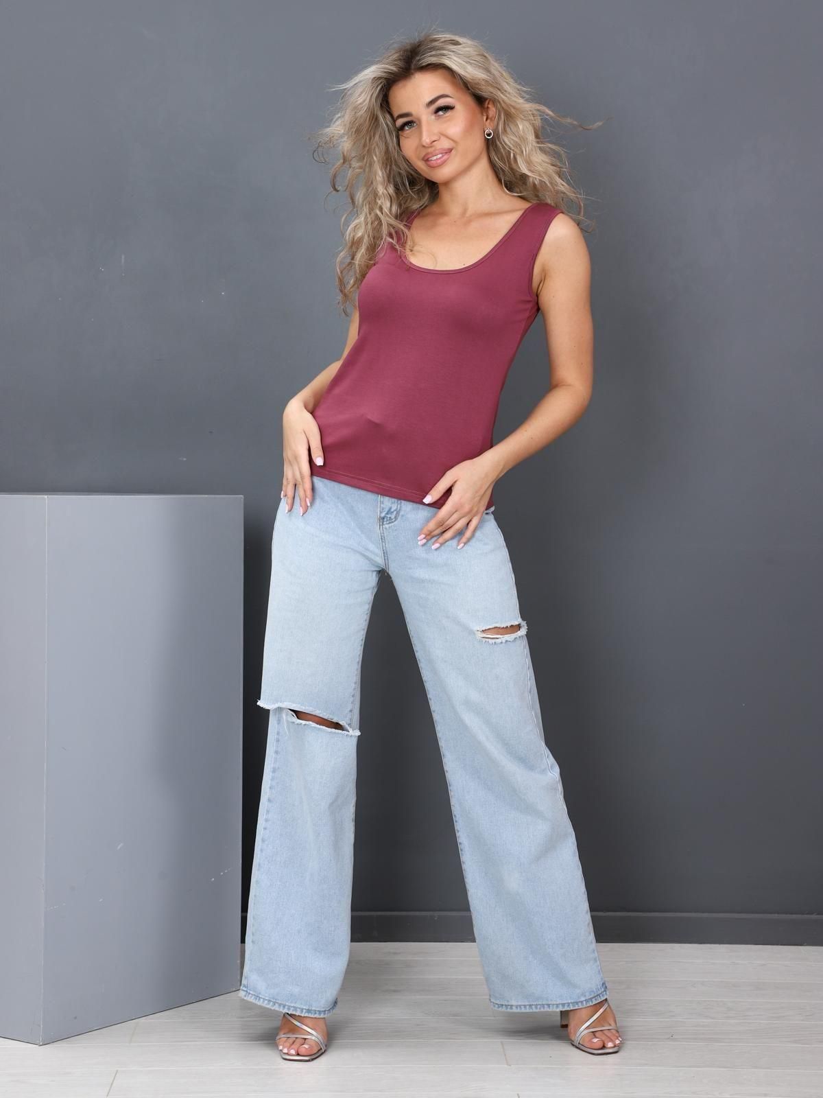 Женская майка выполнена из трикотажного полотна "вискоза". Майка полу прилегающего силуэта, с глубоким вырезом и широкими лямками. Горловина майки и проймы обработаны бейкой.