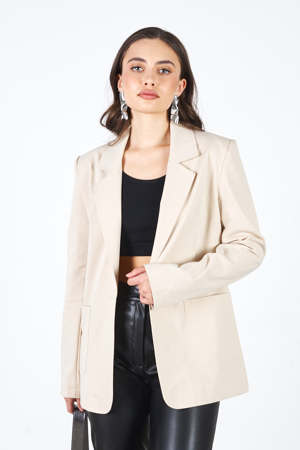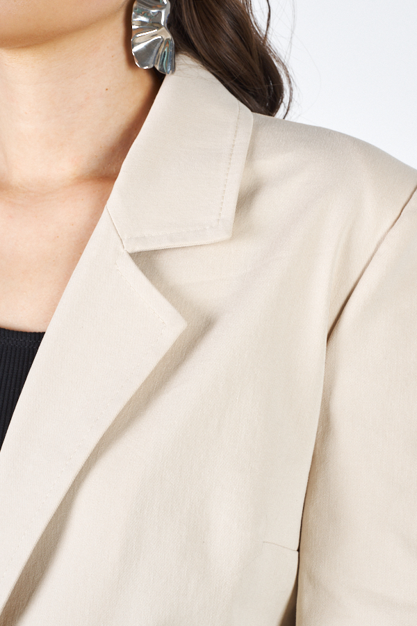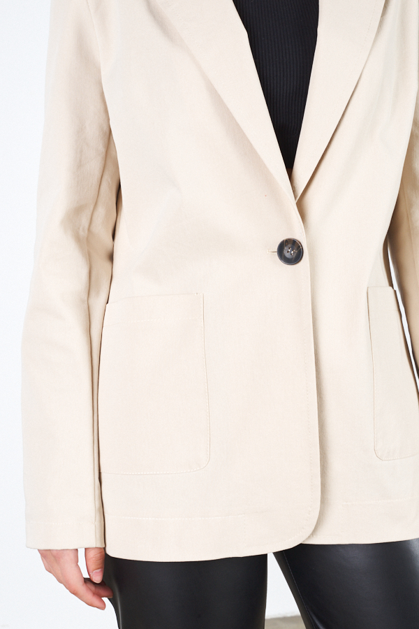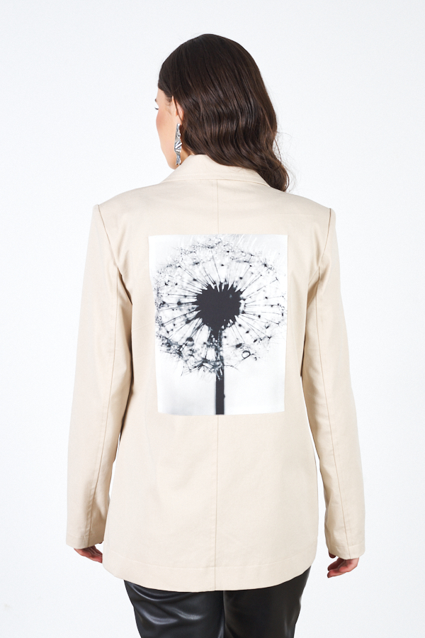 Жакет прямого силуэта с английским воротником из хлопковой ткани. На передней части жакета застежка на пуговицу и накладные карманы. На спинке изделия выполнена аппликация. Втачной длинный рукав. Изделие имеет четкую линию плеча благодаря плечевым накладкам.