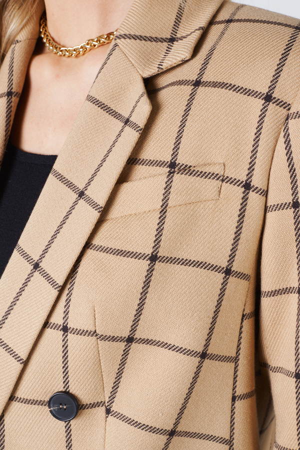 Двубортный жакет из костюмной ткани. Изделие полуприлегающего силуэта с английским воротником и застежкой на пуговицы. На передней части жакета выполнен нагрудный карман с листочкой и карманы в рамку с клапаном. По центру задней части выполнена шлица - элемент декоративный и необходимый. Обеспечивает свободу движения, добавляет шику и элегантности. Втачной длинный рукав, снизу имитация шлицы с пуговицами. Изделие идеально держит форму, имеет четкую линию плеча благодаря плечевым накладкам. Жакет на подкладке.