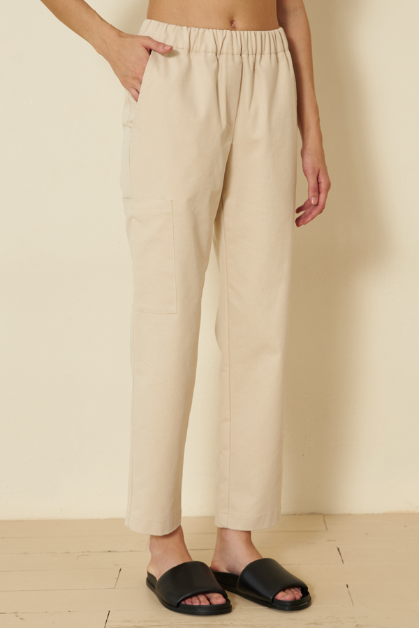 Брюки из хлопковой ткани, зауженные книзу. В боковых швах выполнены карманы с подкройным бочком. Пояс с эластичной резиной. На передней части брюк имитация гульфика, на бедре- карман.