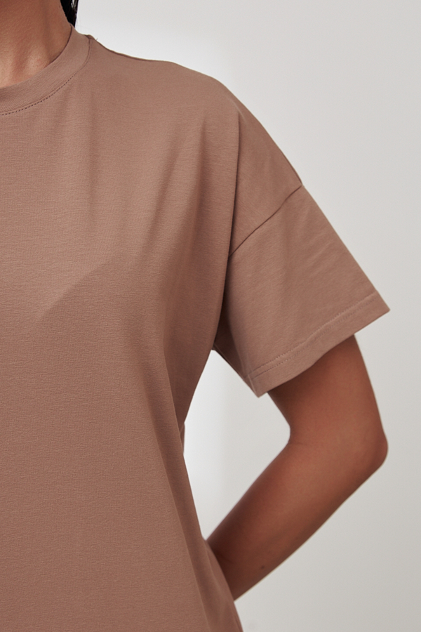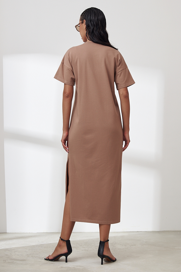 Платье из хлопкового эластичного полотна. Свободный силуэт с разрезами в боковых швах. Короткий втачной рукав в спущенную пройму. Вырез горловины оформлен бейкой.