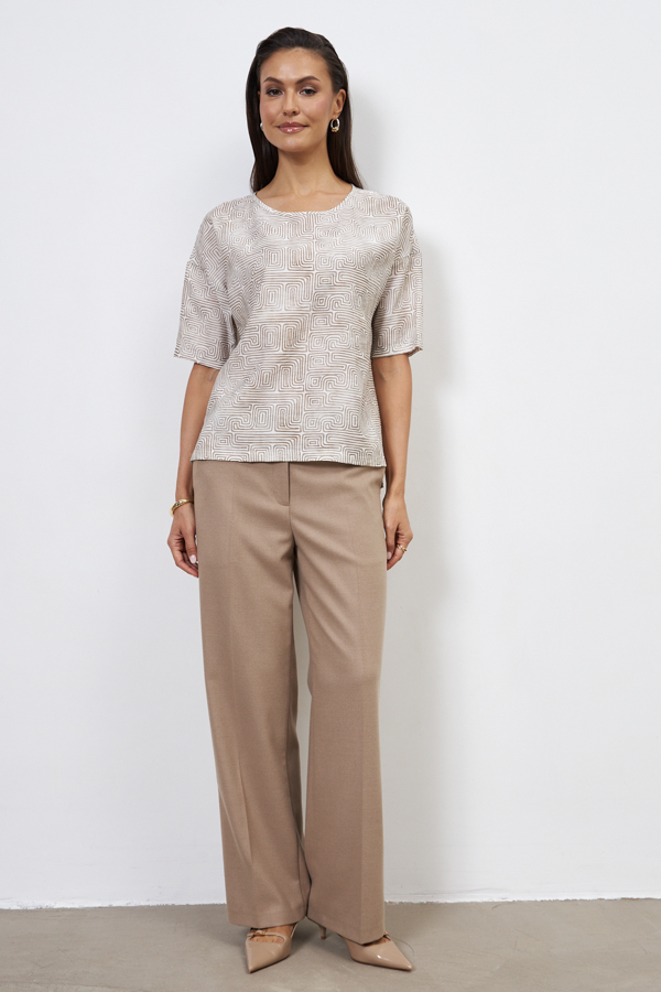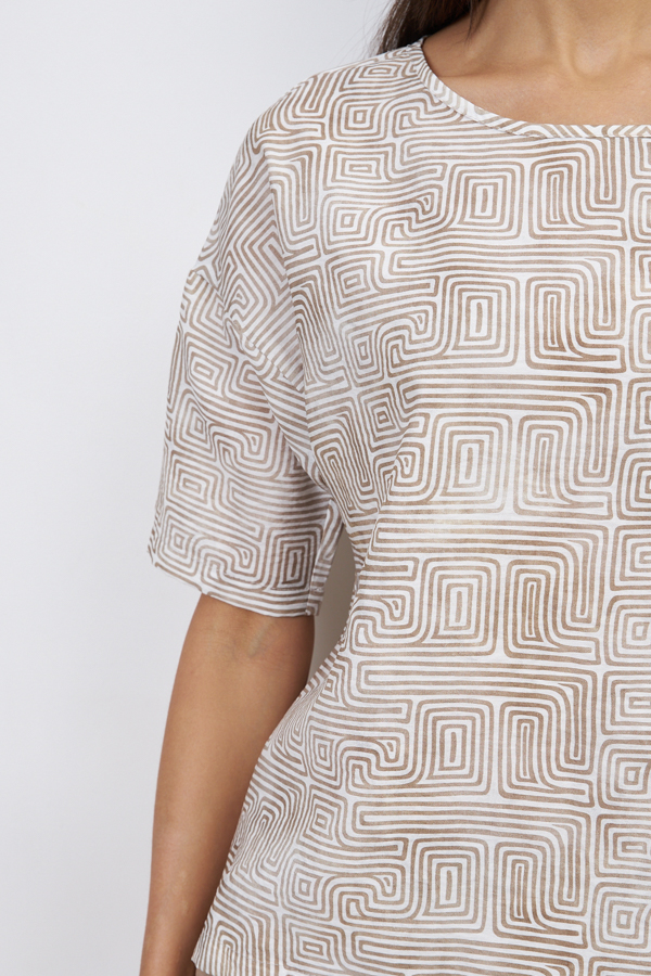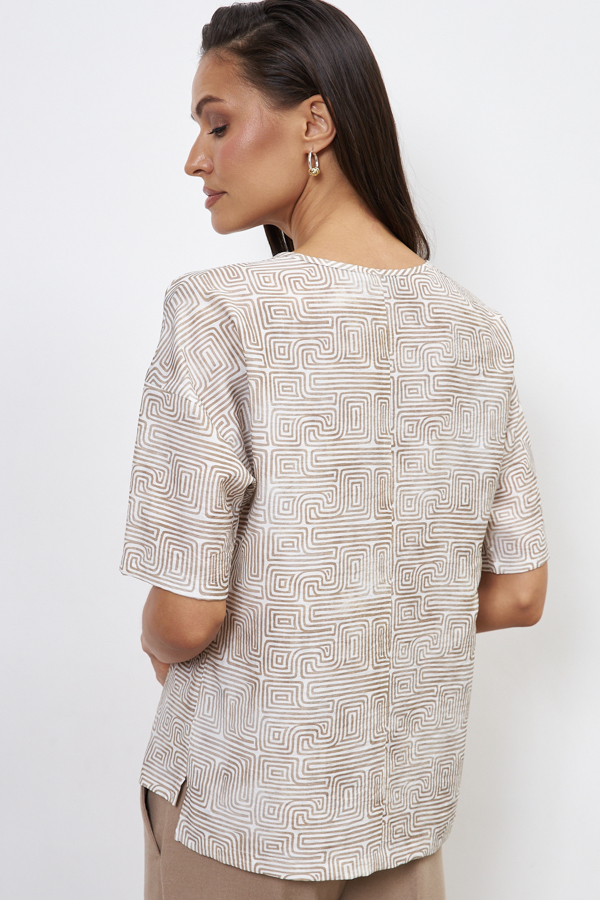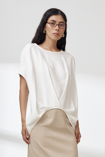 Блуза из вискозной ткани свободного силуэта. Низ изделия асимметричной длины (спинка удлинена относительно переда) с разрезами в боковых швах. Втачной рукав в спущенную пройму. Круглый вырез горловины оформлен косой бейкой из основной ткани.