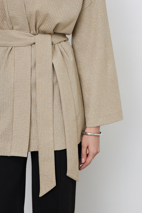 Кардиган из фактурного эластичного полотна с люрексом. Свободный силуэт с притачной планкой. Втачной широкий рукав в спущенную пройму. В комплекте пояс, позволяющий создавать приталенный силуэт.