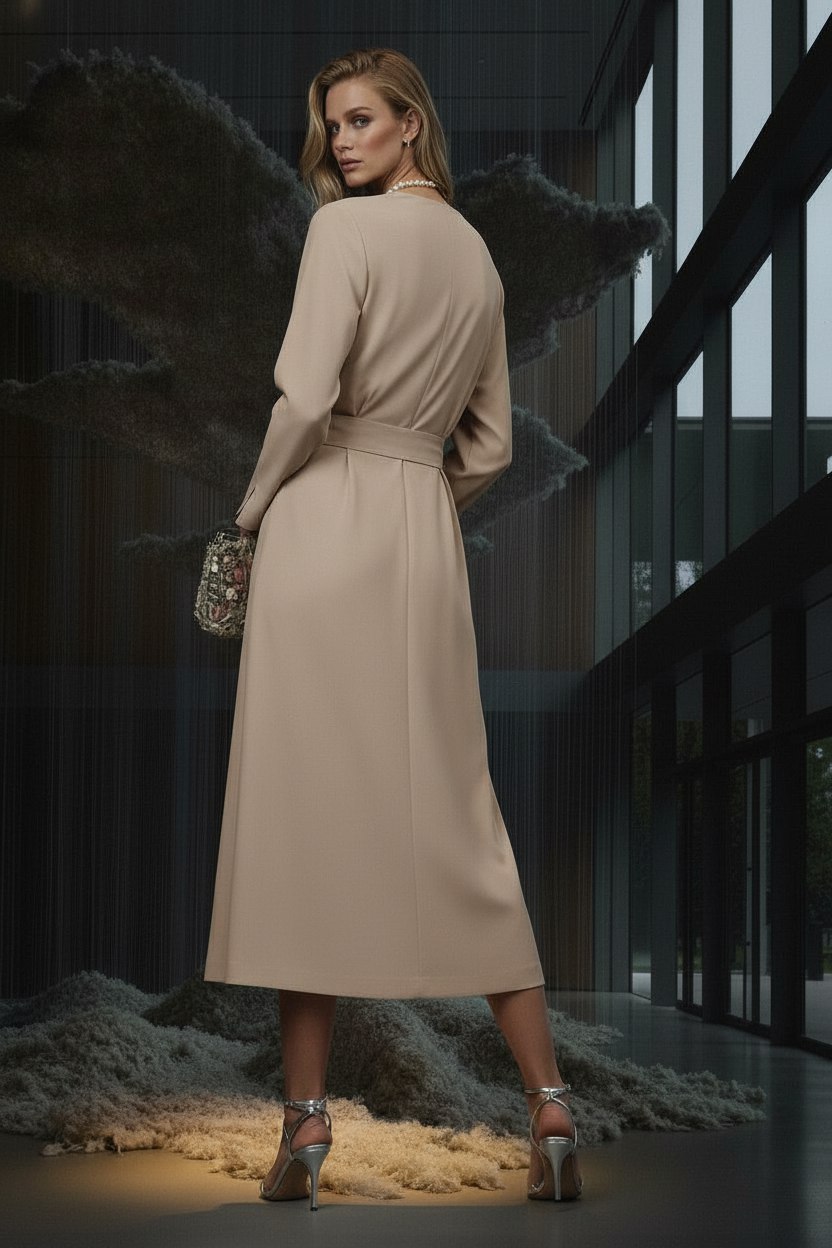 Платье свободного силуэта из плательной ткани. По центру передней части изделия выполнен шов. Цельнокроеная стойка, переходящая в V-образный вырез горловины, визуально делает фигуру стройнее. Втачной длинный рукав с центральным швом и декоративным разрезом по низу рукава. В комплекте пояс из основной ткани.