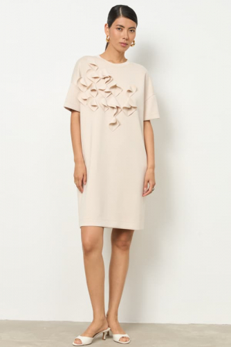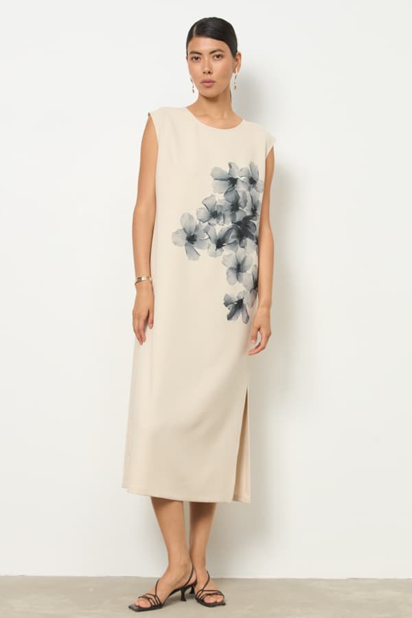 Платье из плательной ткани полуприлегающего силуэта с разрезом в боковом шве. Круглый вырез горловины.