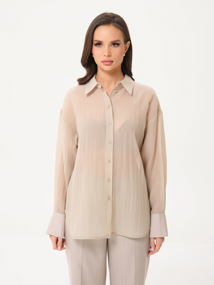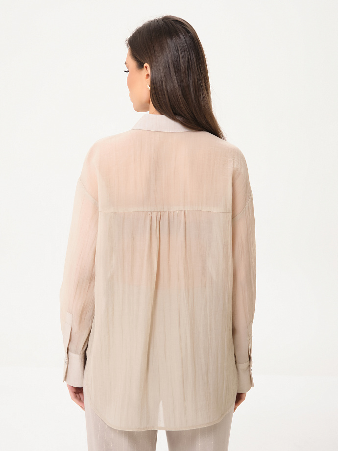 Модель прямого силуэта, со спущенным плечом. Спереди застёжка на петли и пуговицы. Спинка с кокеткой, под кокеткой сборка. Воротник сорочечный. По низу рукава защип, планка и закруглённая манжета с застёжкой на пуговицы. Низ блузки закруглён.