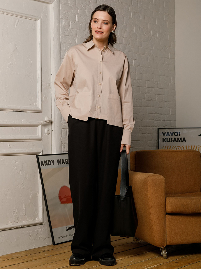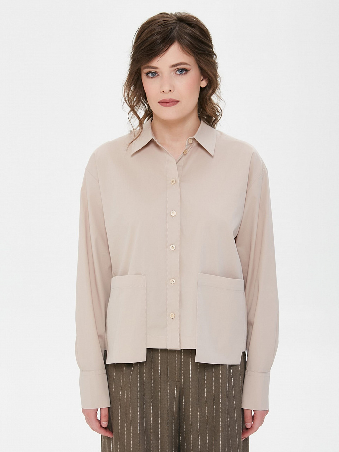 Модель прямого силуэта, со спущенным плечом. Спереди планка с застёжкой на петли и пуговицы. Накладные карманы выходят за линию низа. Спинка с кокеткой, переходящей ина перед. Под кокеткой сборка. Слева на кокетке текстовый принт. По низу рукава планка и манжета с застёжкой на пуговицы. Воротник сорочечный.