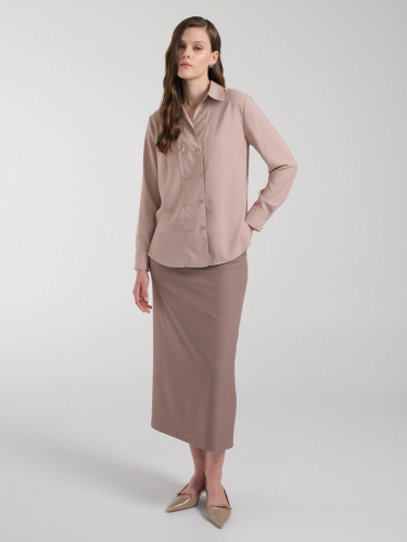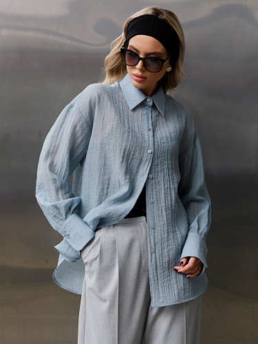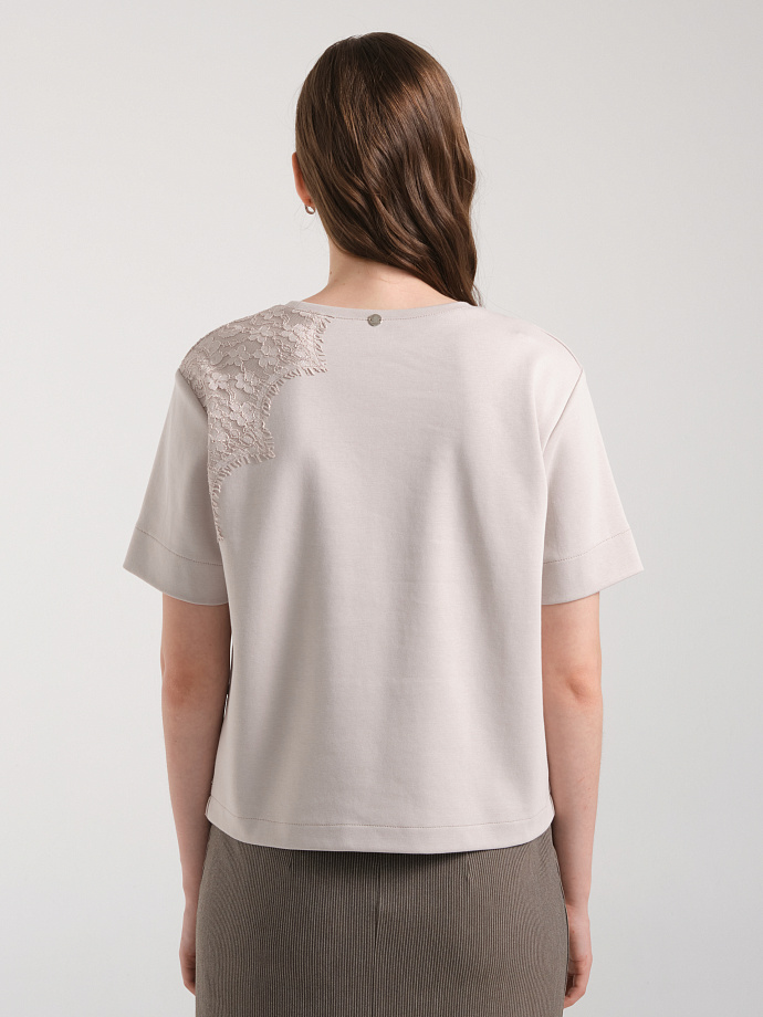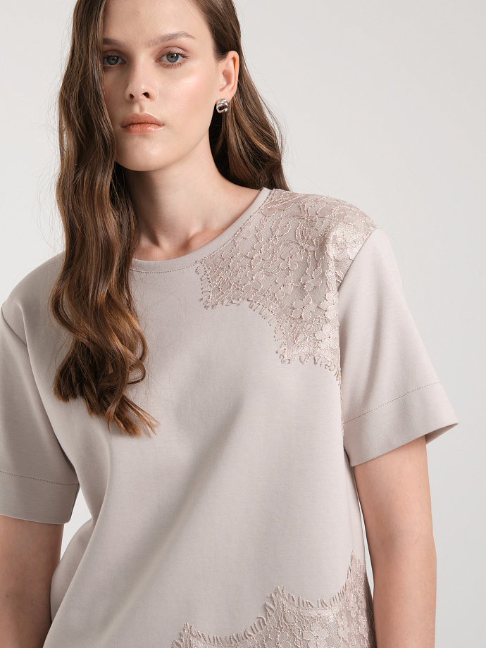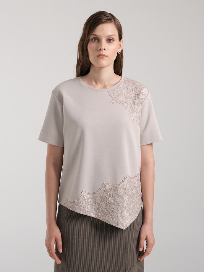 Модель прямого силуэта, со спущенным плечом, коротким рукавом и фигурной ассиметричной линией низа. Горловина обработана бейкой.