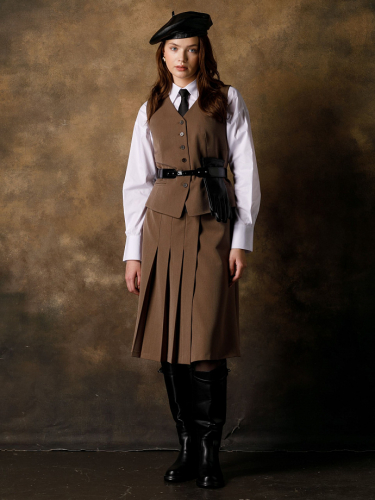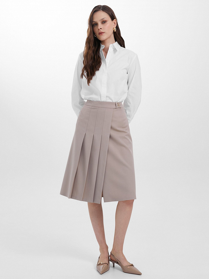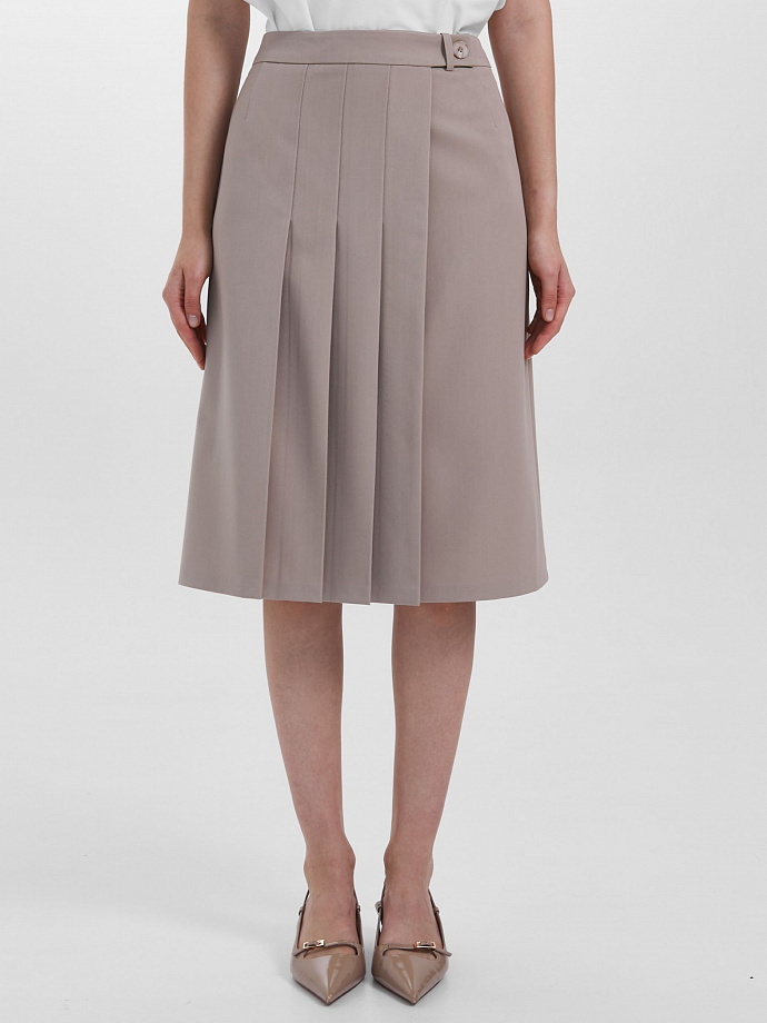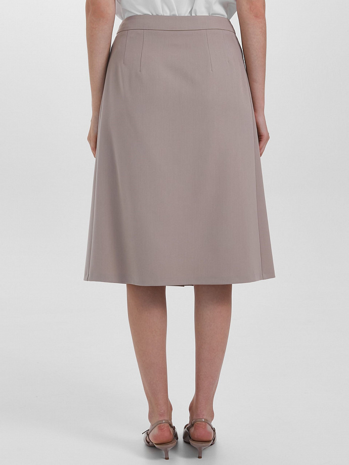 Модель А-образного силуэта, без подклада, на подкройном поясе. На поясе шлёвка и застёжка на петли и пуговицы. Спереди частично застрочены односторонние складки.
