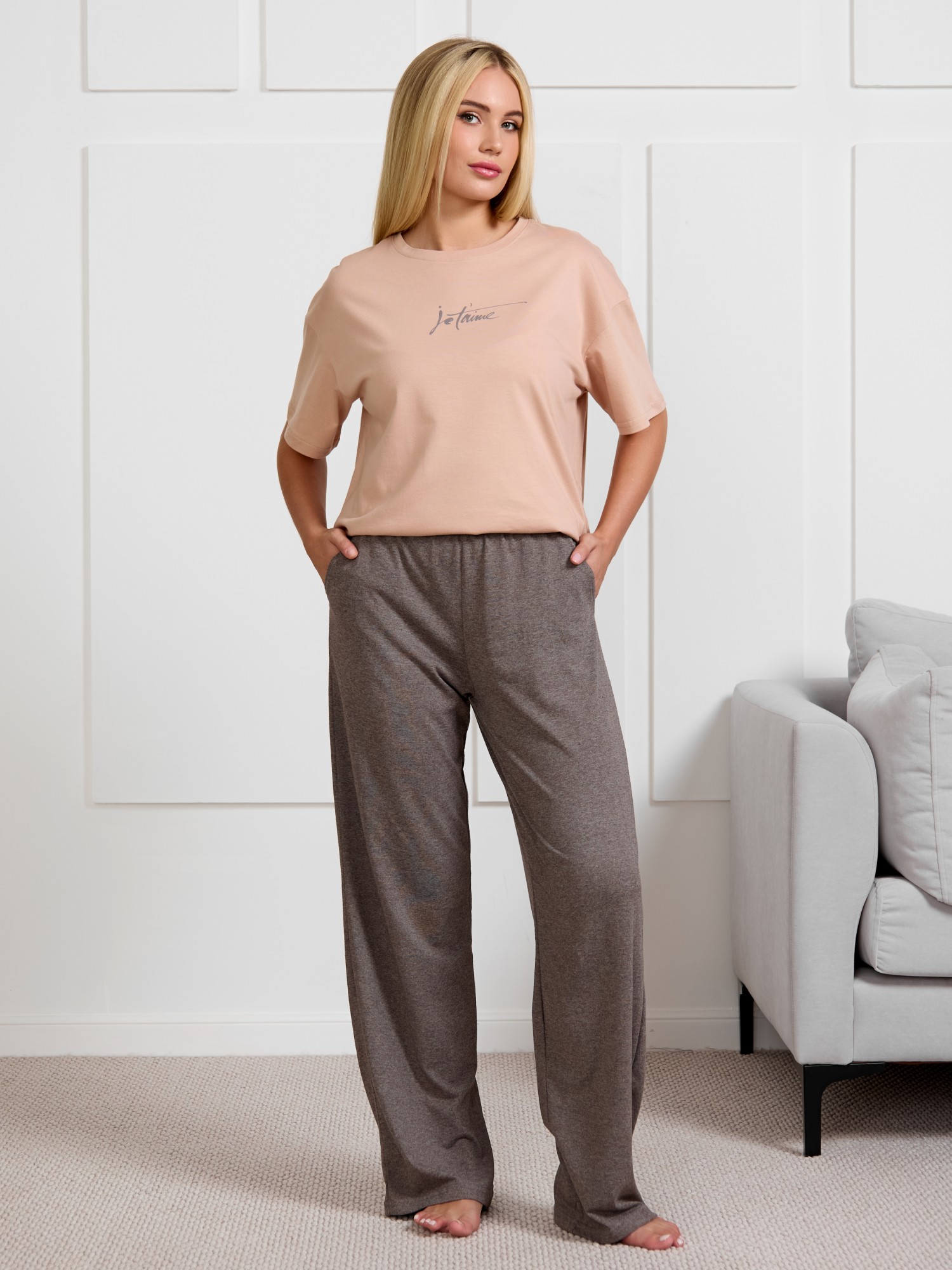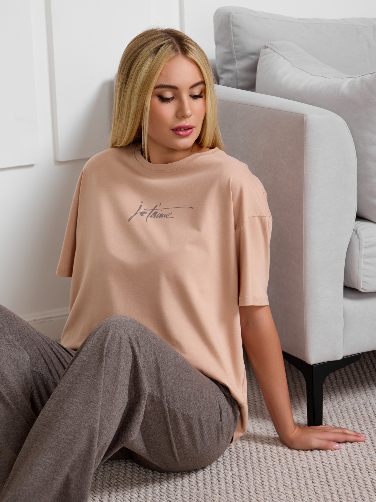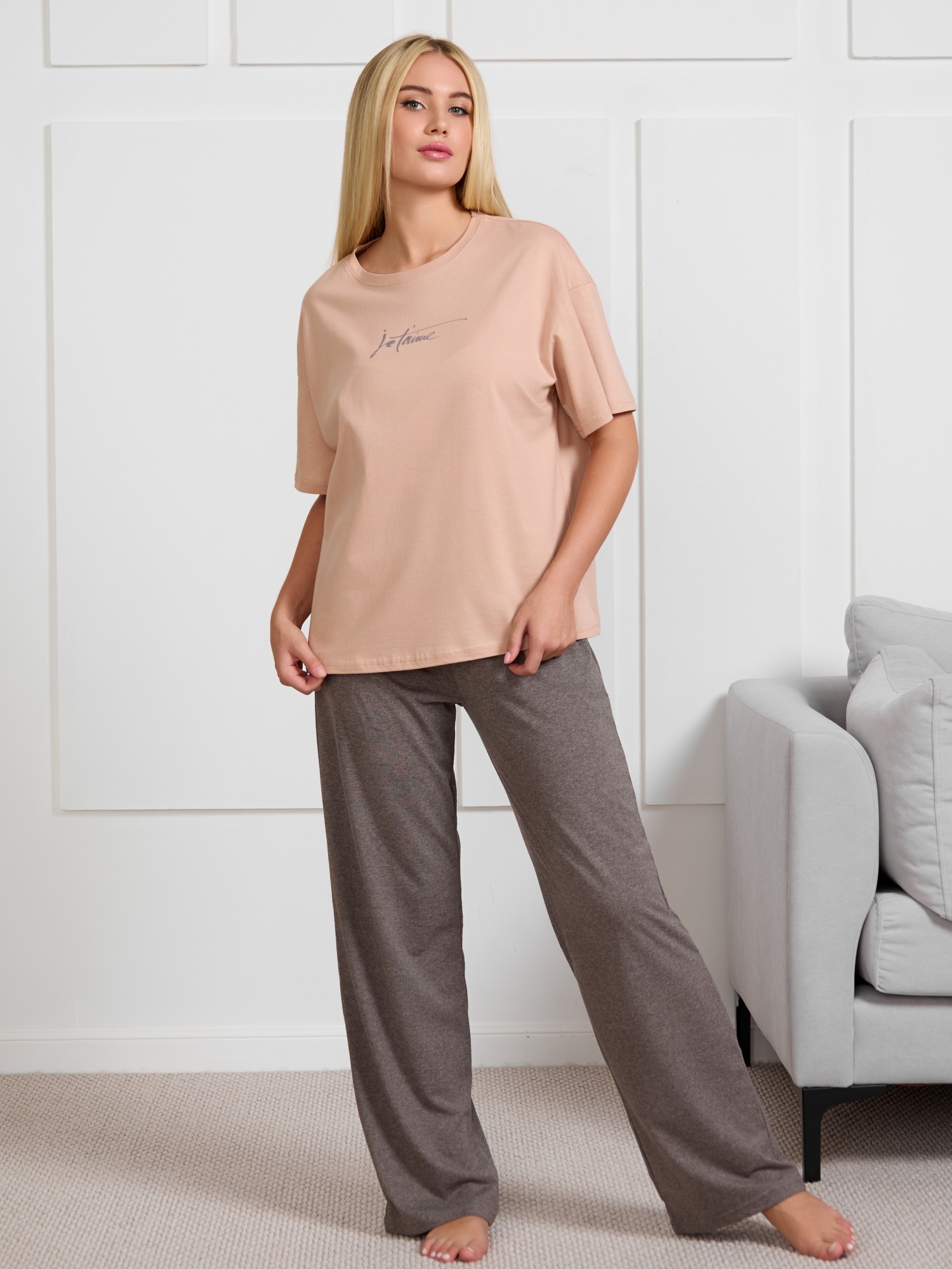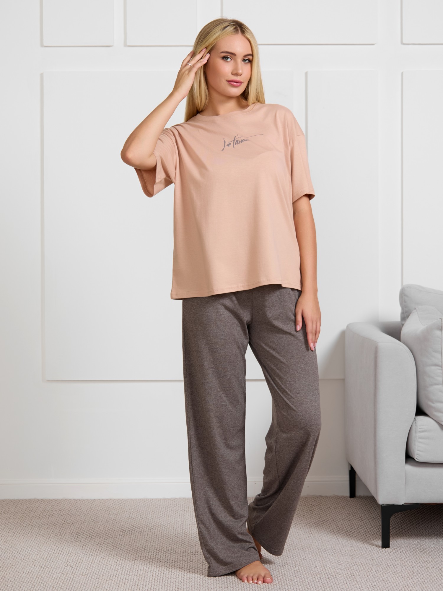 Костюм женский из трикотажного полотна в комбинации двух видов тканей: «кулирка» и «меланжированная кулирка» состоящий из футболки и брюк. Футболка - из гладкокрашенного полотна «кулирка», классического покроя, с короткими втачными рукавами, горловиной овальной формы и принтом на полочке, выполненным в технике «шелкографии». Горловина обработана притачной бейкой из основного материала.Брюки – из гладкокрашенного полотна «кулирка/меланж» контрастного цвета, длинные, классического кроя, с карманами в боковых швах, на притачном поясе с эластичной тесьмой внутри.