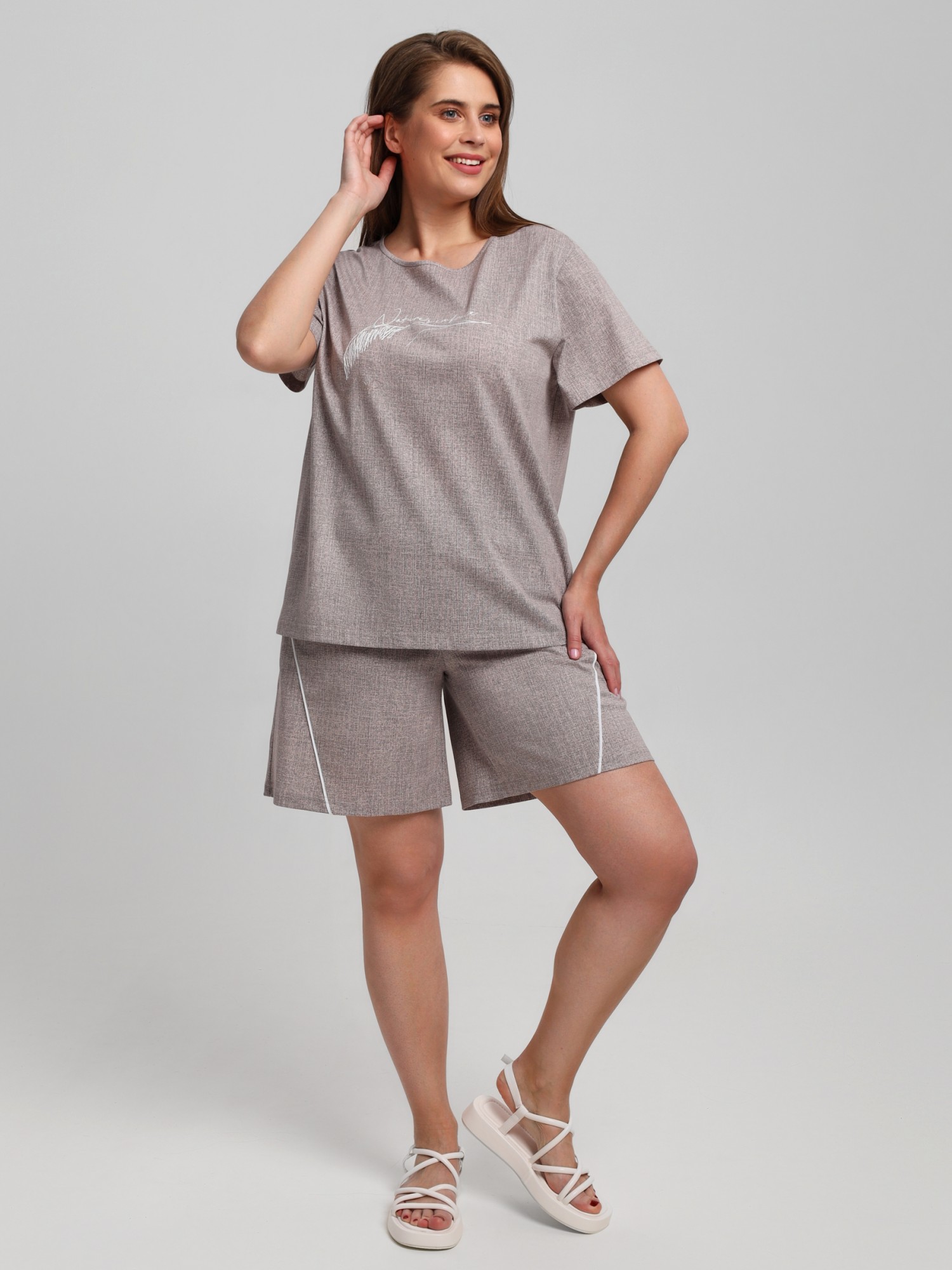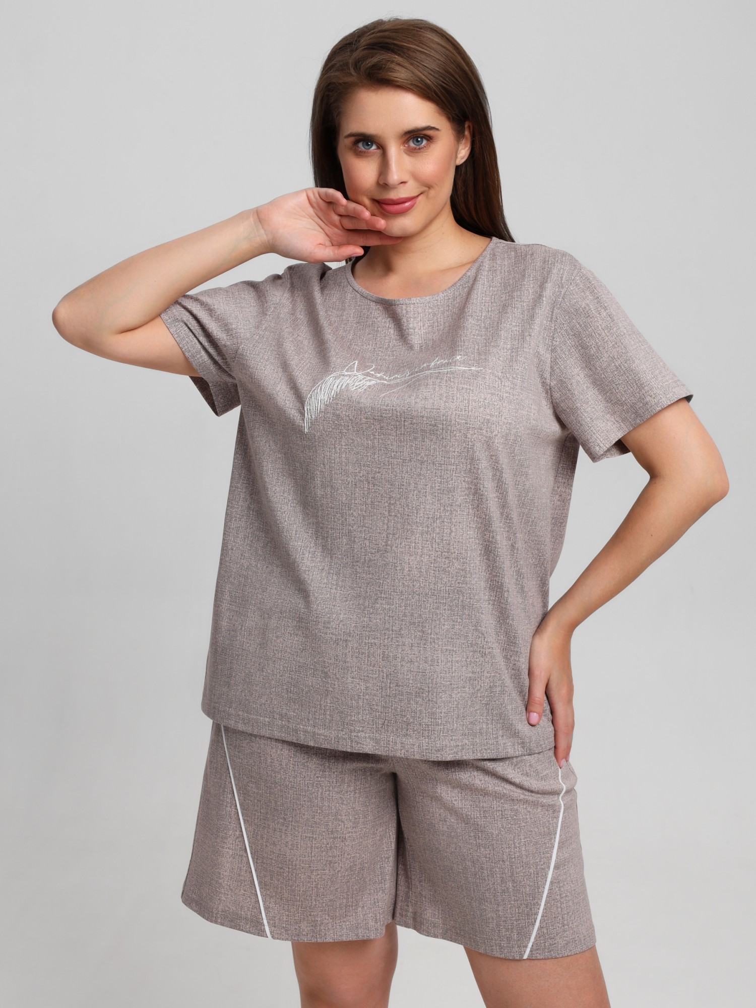 Костюм женский из трикотажного полотна «кулирка» с набивным рисунком, состоящий Футболка – из полотна с набивным рисунком, свободного покроя, с короткими втачными рукавами, горловиной овальной формы, окантованной основным материалом. На полочке выполнена вышивка.Шорты - из полотна с набивным рисунком, свободные, с карманами в боковых швах, на притачном поясе с эластичной тесьмой внутри. Детали передних половин разрезаны по косой, в шве соединения кант контрастного цвета.