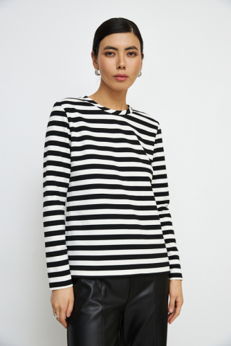 Джемпер свободного силуэта из эластичного полотна. Вырез горловины оформлен бейкой из основной ткани. Втачной длинный рукав.
