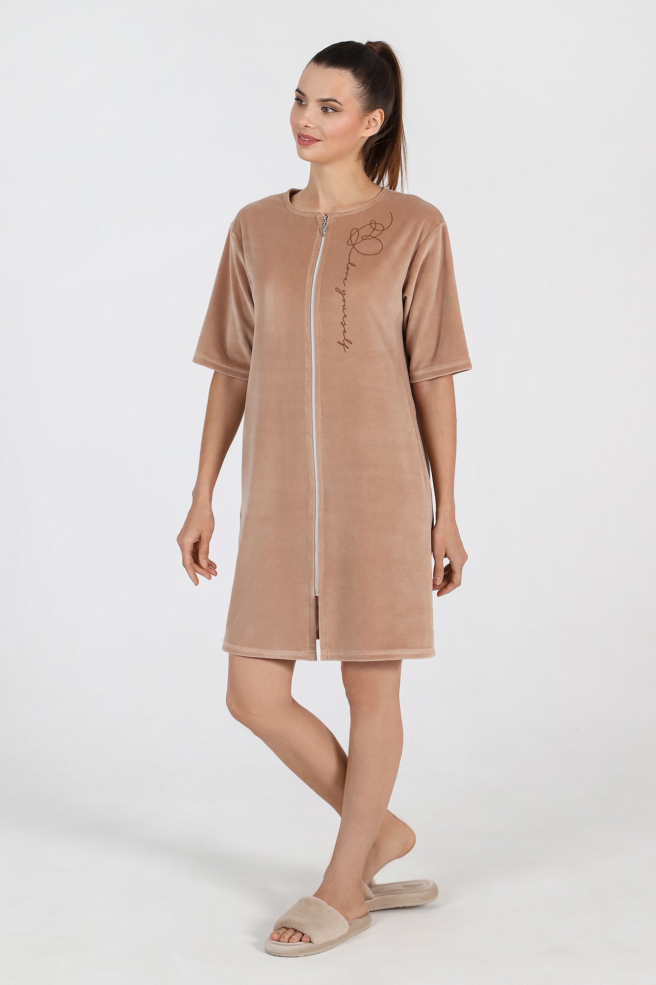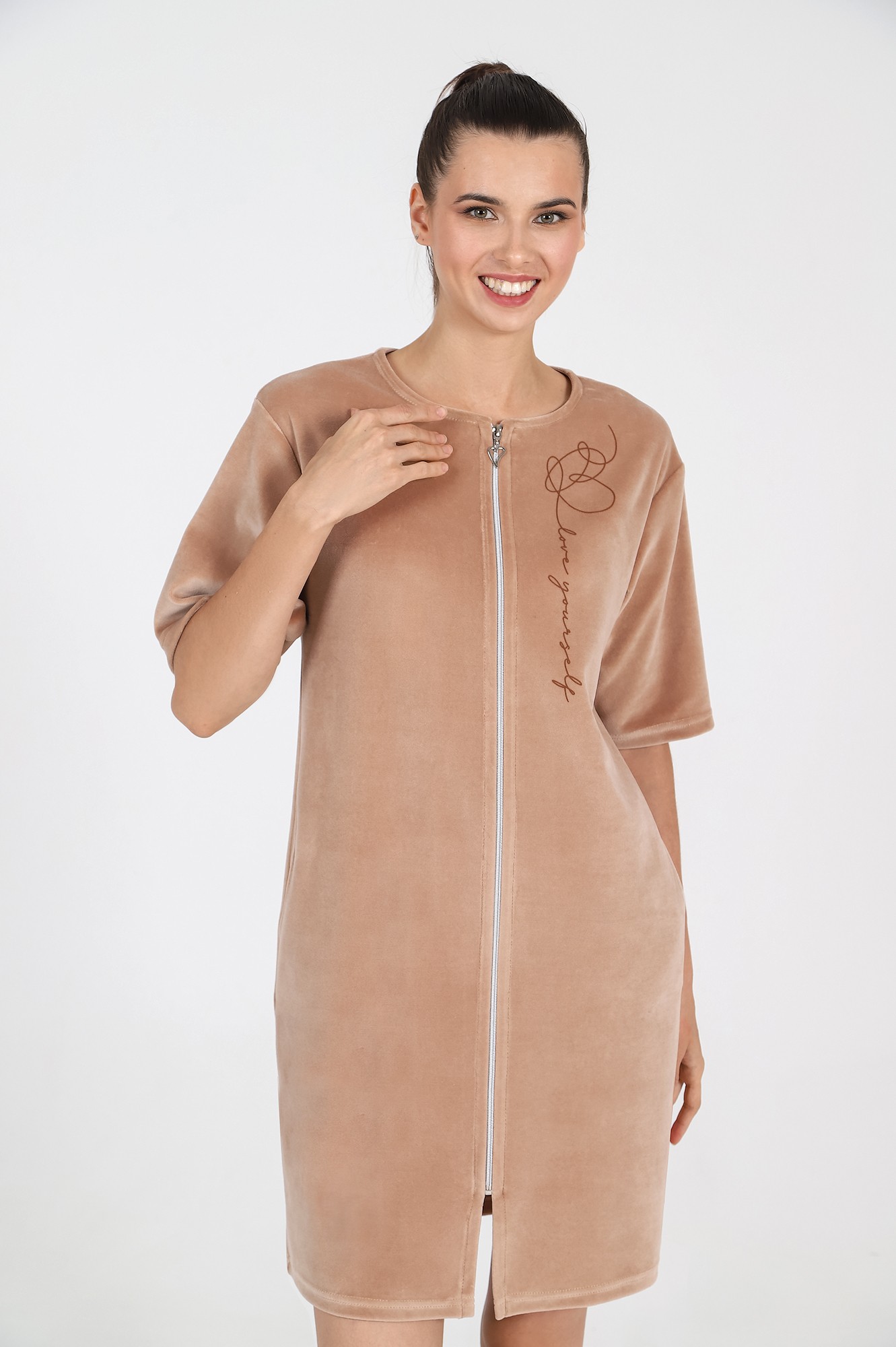 Халат из гладкокрашеного полотна «велюр», прямого силуэта, с втачными рукавами длиной ¾, горловиной овальной формы, карманами в боковых швах и центральной бортовой застежкой на тесьму «молния». На полочке выполнена печать в технике «шелкографии».