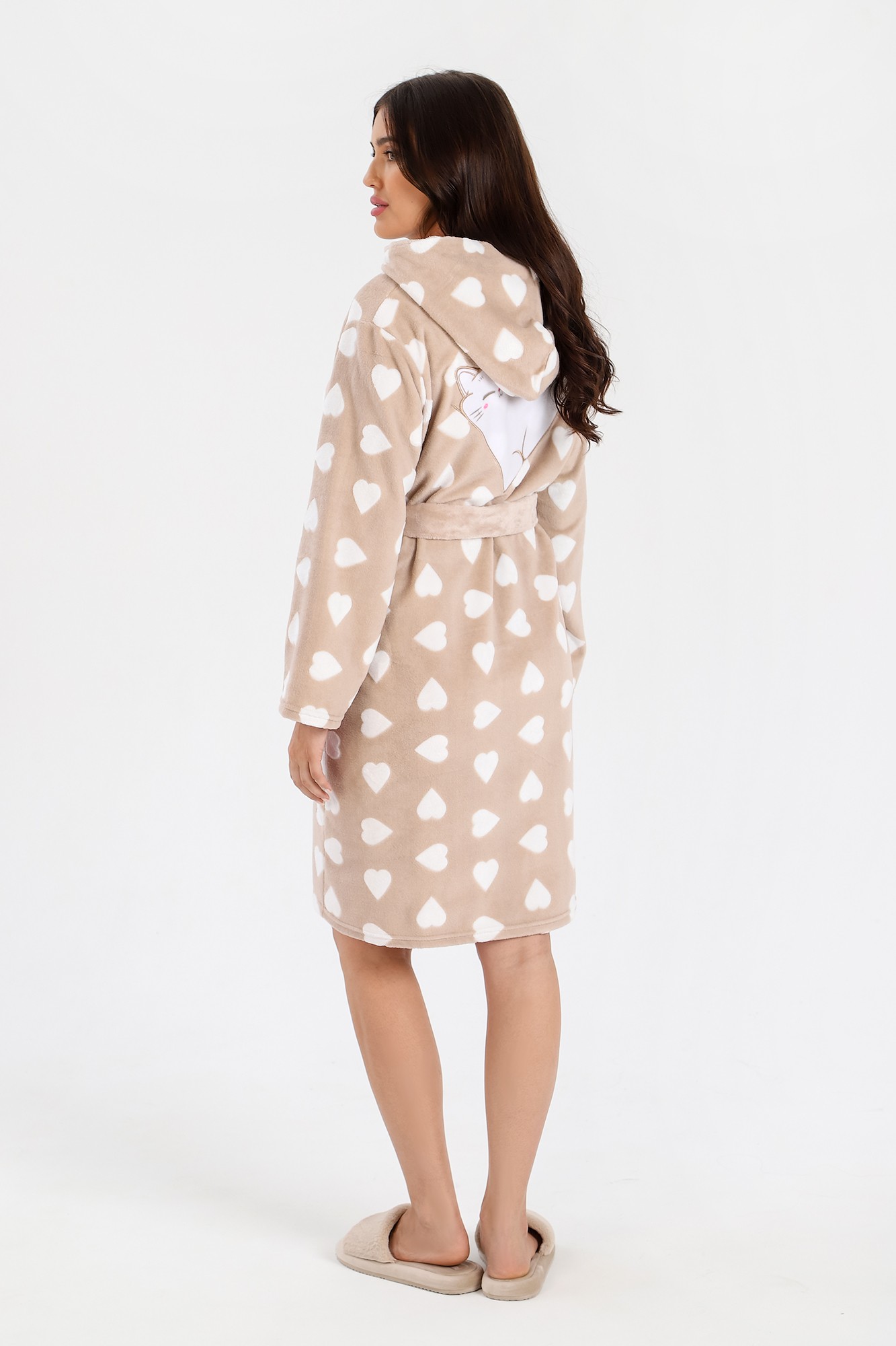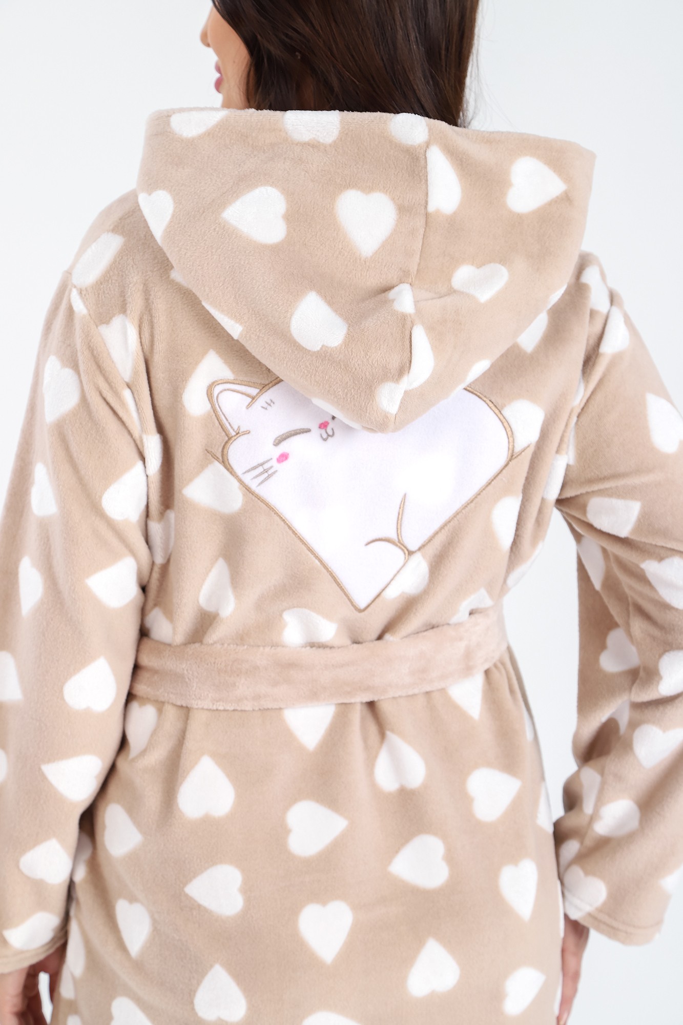 Халат из тканого полотна «ультрасофт», прямого силуэта, с длинными втачными рукавами, капюшоном, карманами в боковых швах, вышивкой – аппликацией в верхней части спины и центральной бортовой застежкой на тесьму «молния». Съёмный пояс, завязывающийся на талии вдет в две шлевки, вставленные в боковые швы.