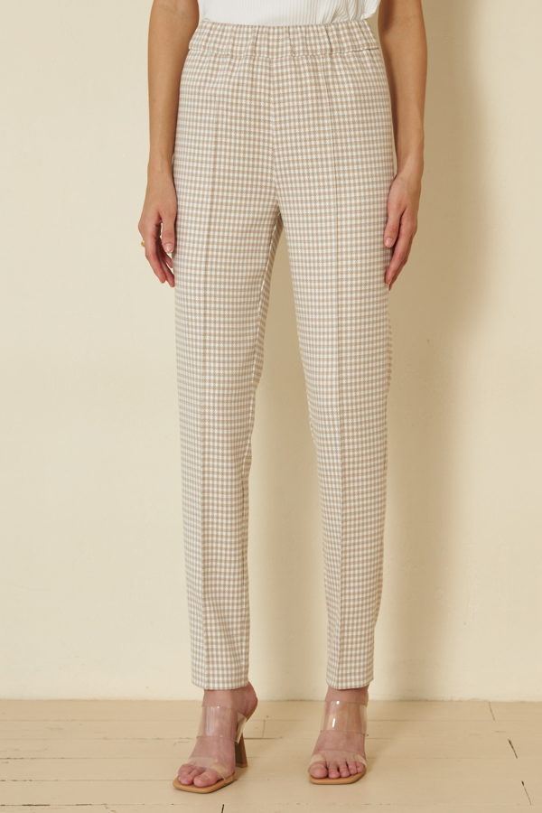 Брюки прямого силуэта, зауженные книзу из костюмной ткани. На передней части брюк застрочены стрелки. Пояс притачной с эластичной резиной.