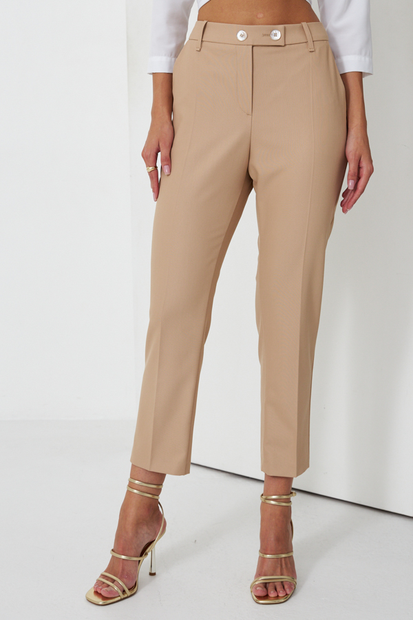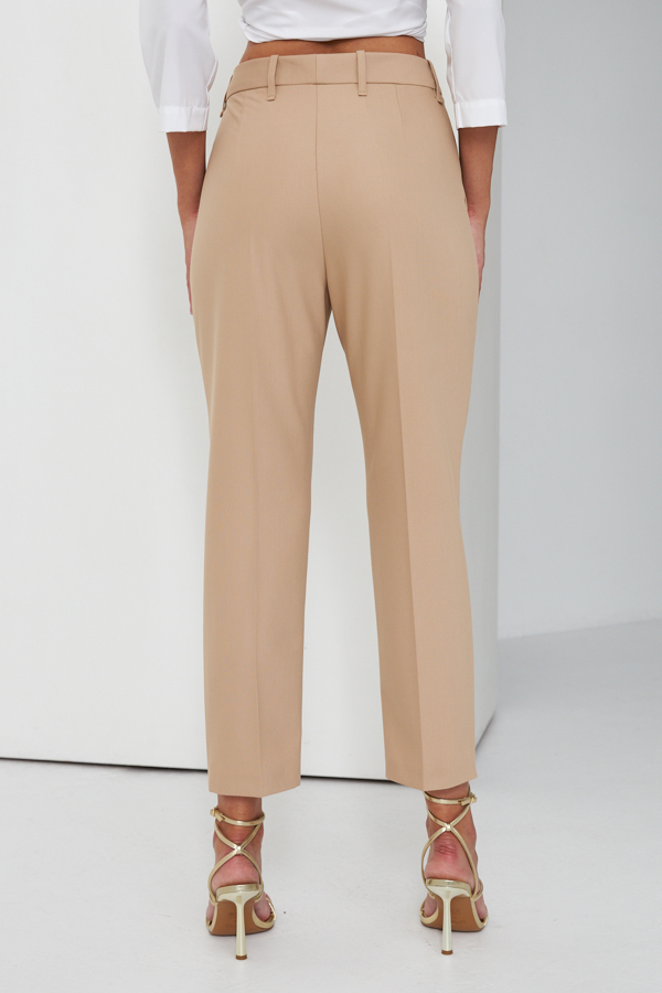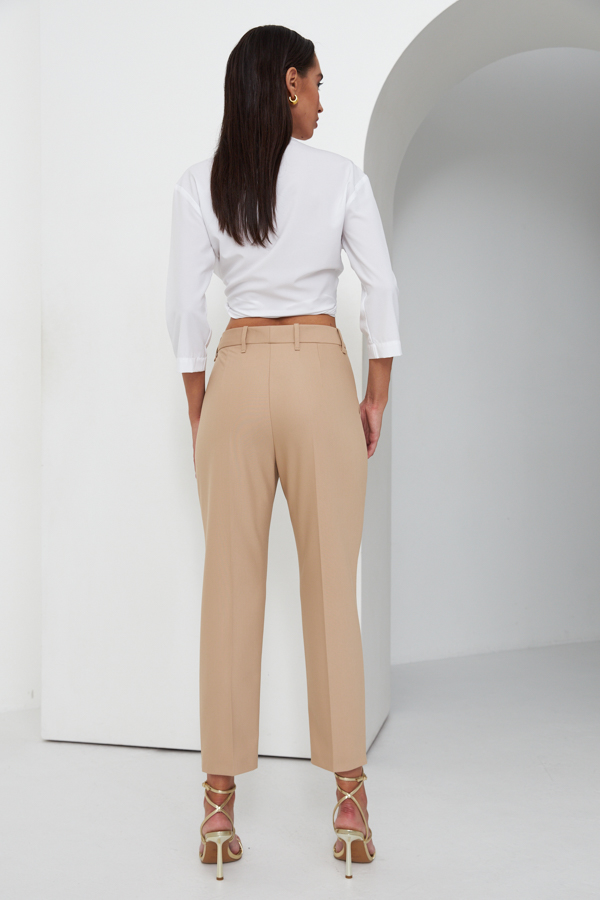 Брюки прямого силуэта, зауженные книзу из костюмной ткани. Застёжка на молнию-гульфик и пуговицу. Карманы с подкройным бочком. Притачной пояс со шлёвками.