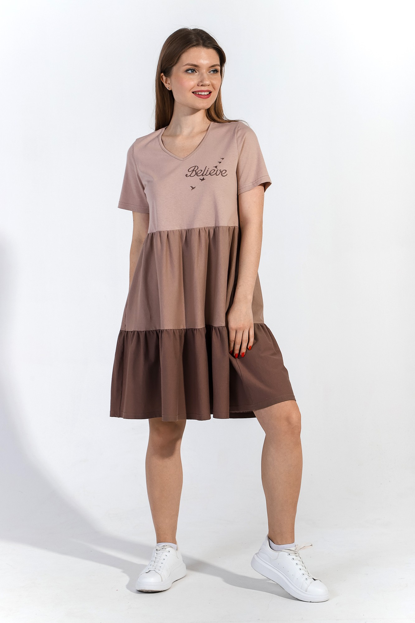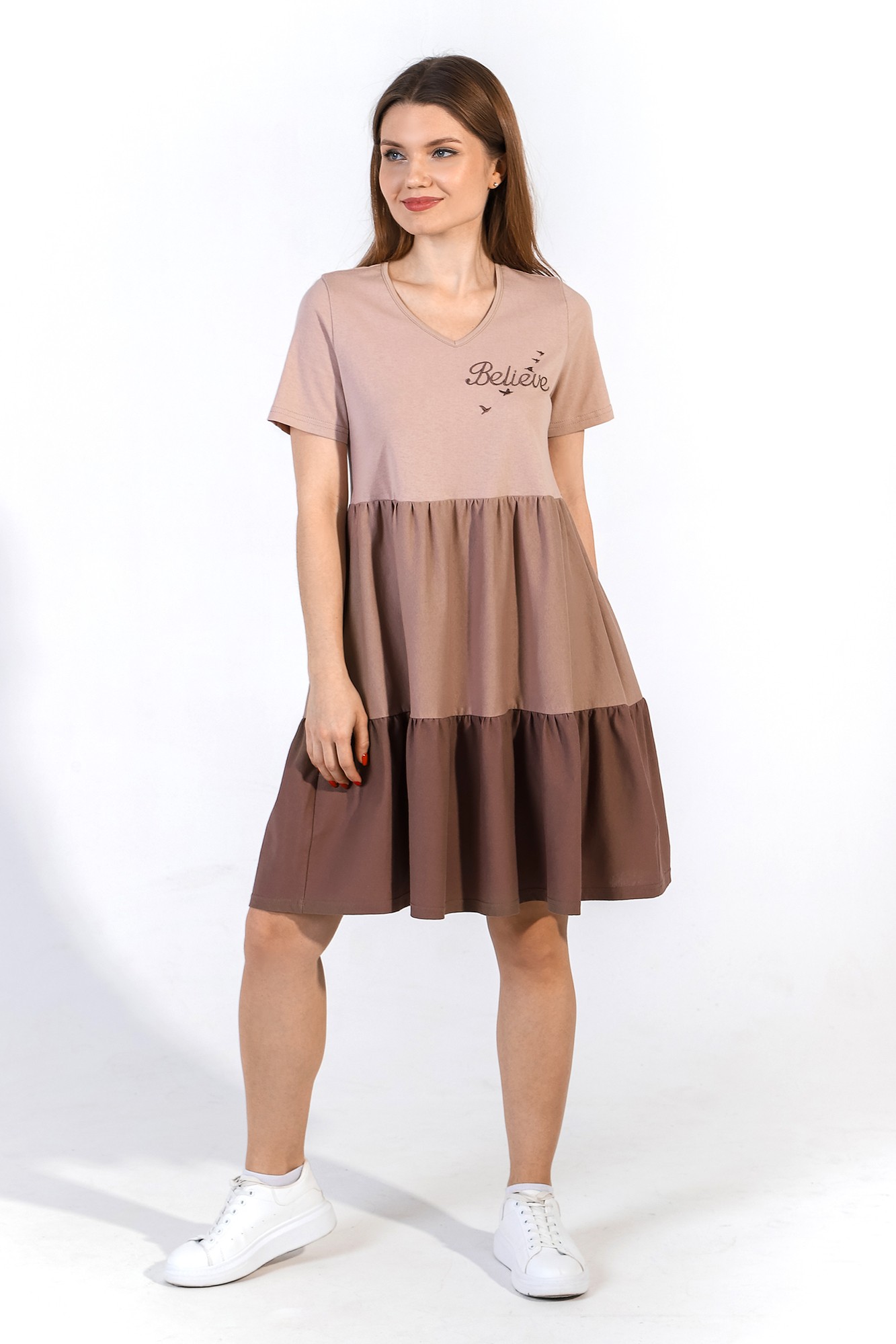 Платье из гладкокрашеного трикотажного полотна «кулирка» в комбинации трех контрастных цветов, отрезное чуть выше линии талии, с короткими втачными рукавами, горловиной v – образной формы, окантованной материалом лифа. Юбка состоит из двух ярусов, выполненных из полотна разных цветов и присборенных по швам стачивания друг с другом и лифом. На полочке слева – вышивка.