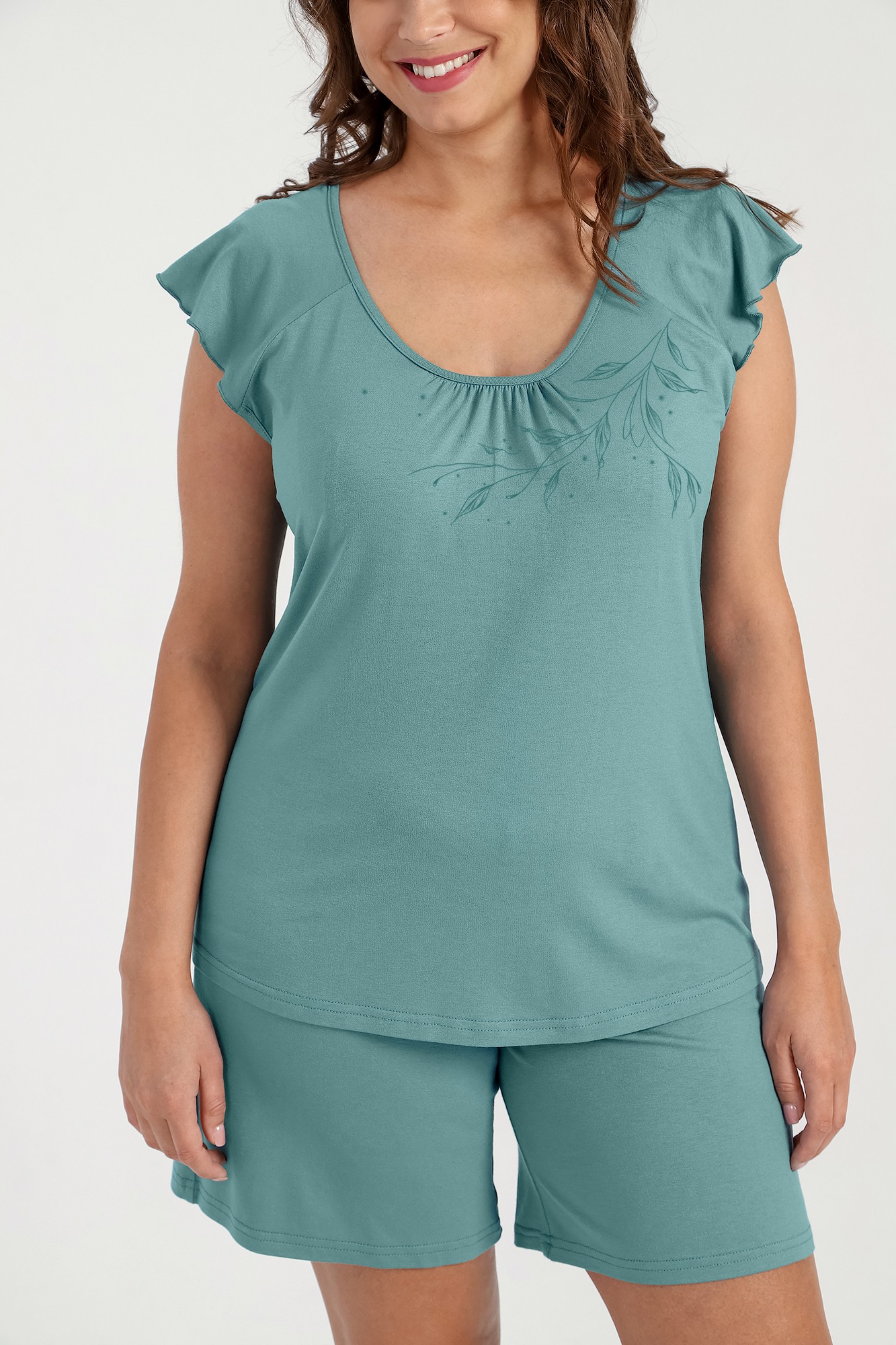 Пижама женская из гладкокрашенного трикотажного вискозного полотна, состоящая из футболки и шорт. Футболка - слегка расширенная книзу, с короткими рукавами покроя «реглан» и горловиной овальной формы. Проймы и горловина окантованы основным материалом. По срезу горловины выполнена небольшая сборка. Нижние срезы рукавов обработаны узкой обметочной строчкой. Шорты – свободного покроя, удлиненные, с эластичной тесьмой по талии.