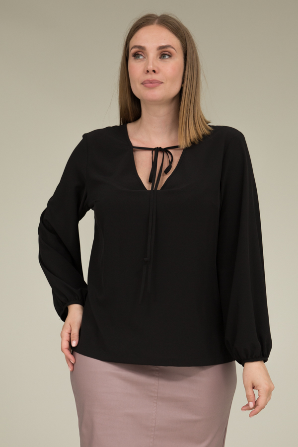 Блуза свободного силуэта из блузочной ткани. Рукав втачной, снизу присборен и окантован бейкой. V-образный вырез горловины с декоративной завязкой.