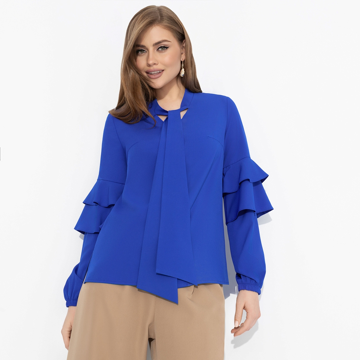Мечтать – одно из твоих любимых занятий. Быть мечтой – твоя судьба. Когда бы он тебя ни увидел, ты выглядишь роскошно. А когда ты была в блузе ЧАРУТТИ в цвете синий электрик, он даже упал в обморок. Блуза с длинным рукавом. Ворот оформлен аккуратными завязками, можно завязать в бант. Рукава дополнены рюшами. Изделие застегивается на пуговицы. Хорошо смотрится в заправленном виде и навыпуск.
