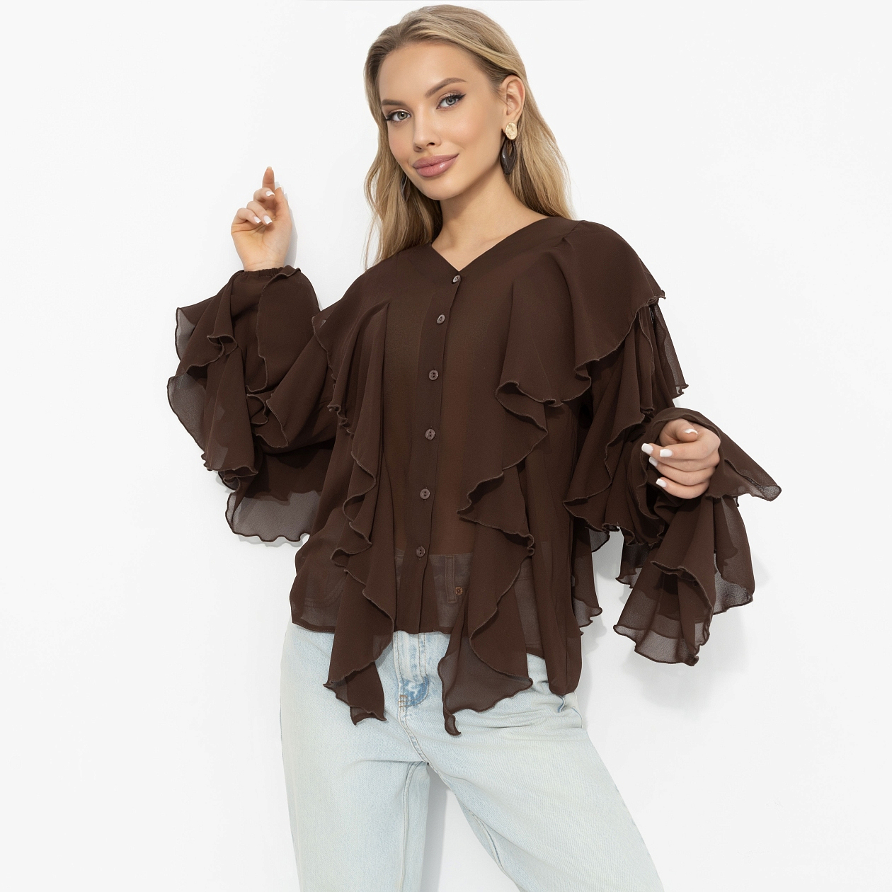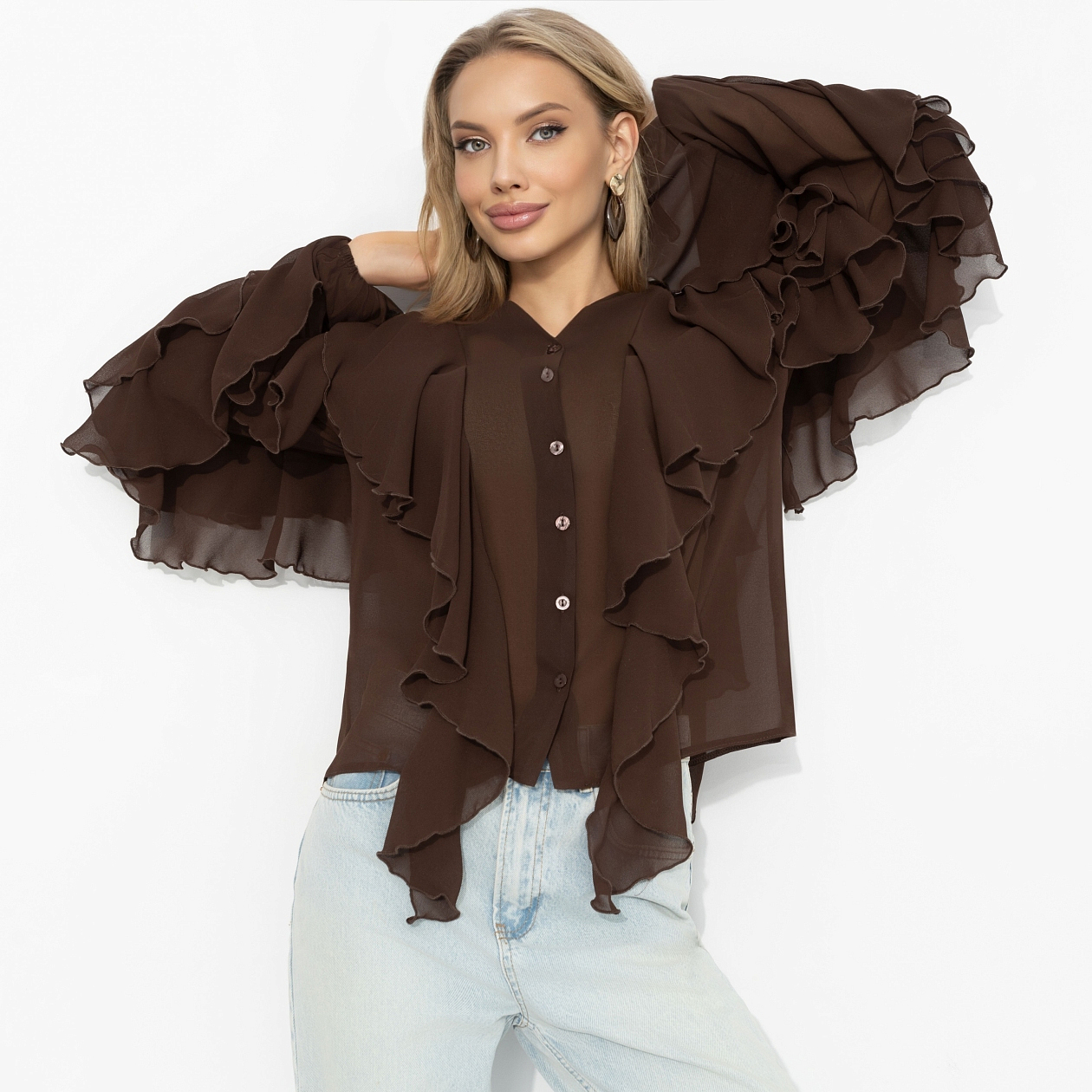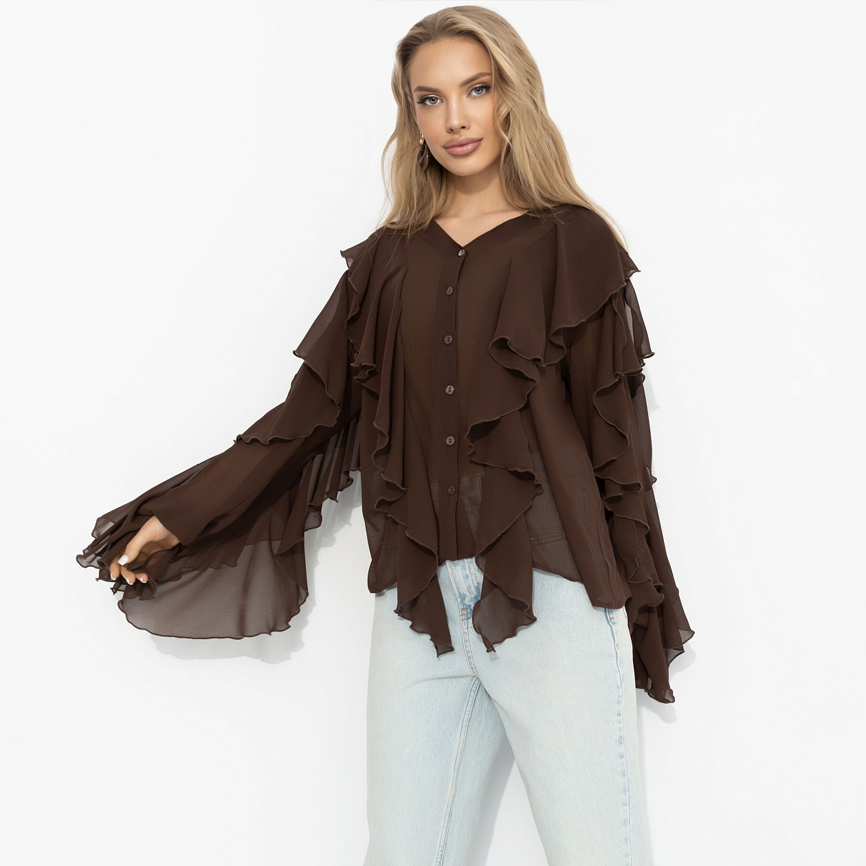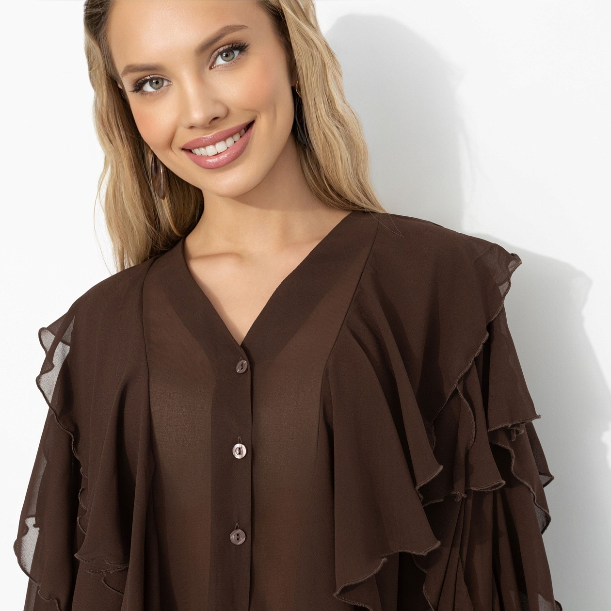 Шоколадный оттенок – как идеальный десерт: тёмный ганаш, мягкий мусс, тонкая карамельная нота. Шифон струится слоями, будто воздушное суфле, воланы добавляют объёма. Образ получается многослойным, насыщенным, с послевкусием роскоши. Хочется рассматривать – и наслаждаться каждым движением. Рукава на резинке. Ткань слегка просвечивает.