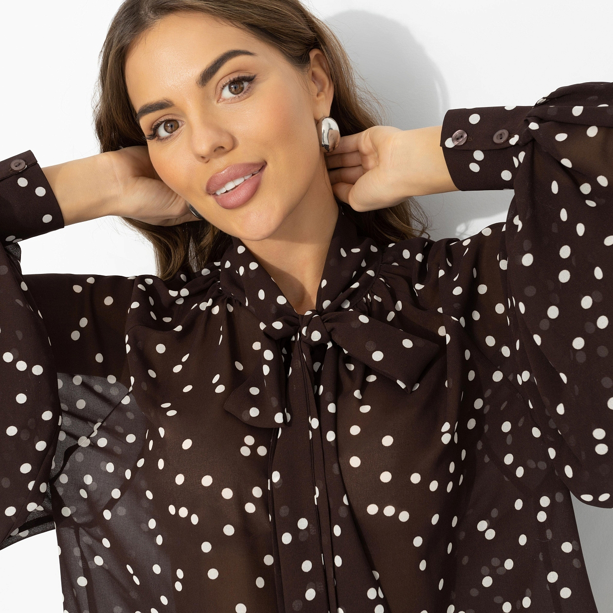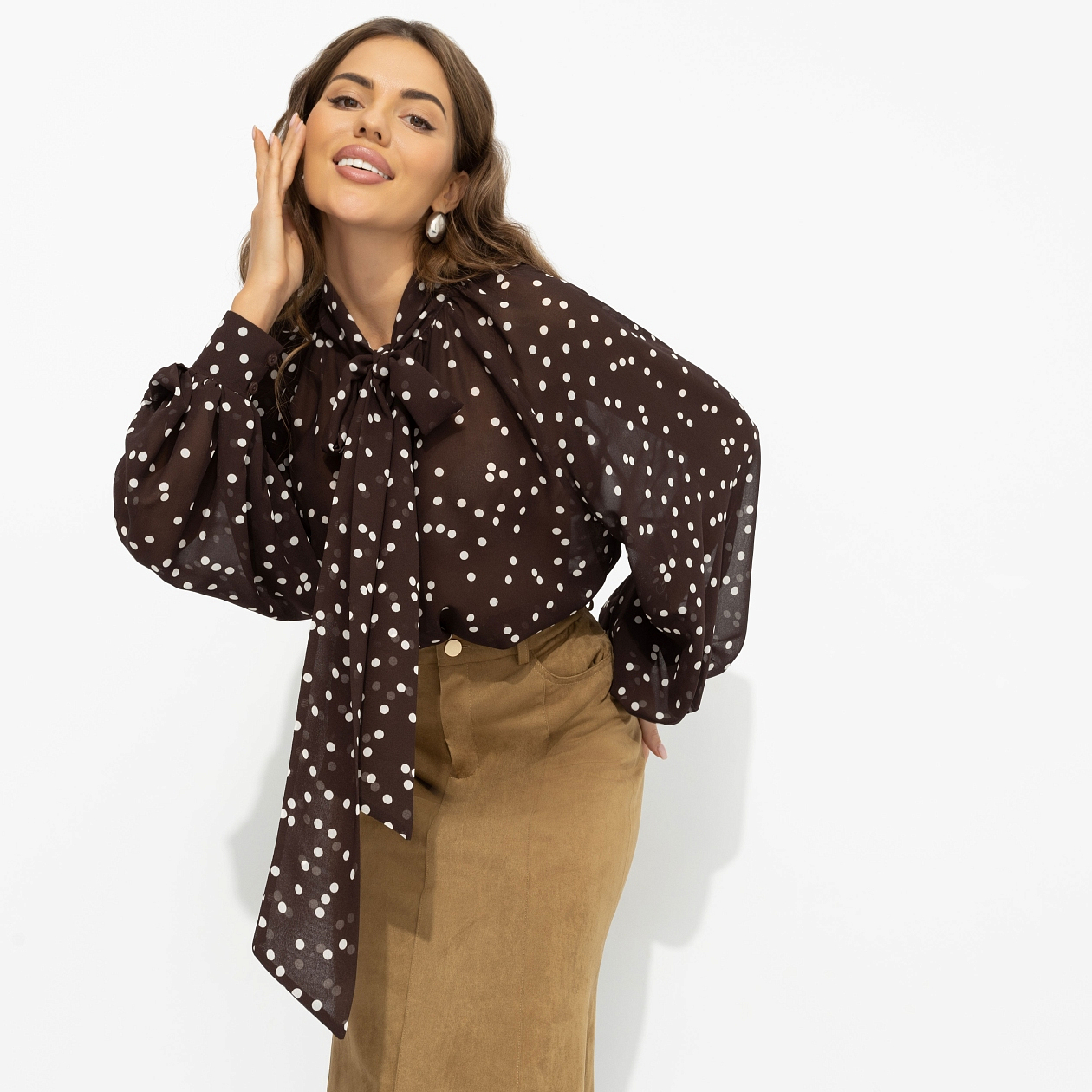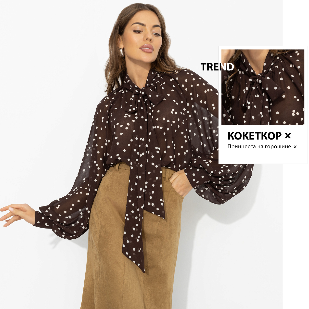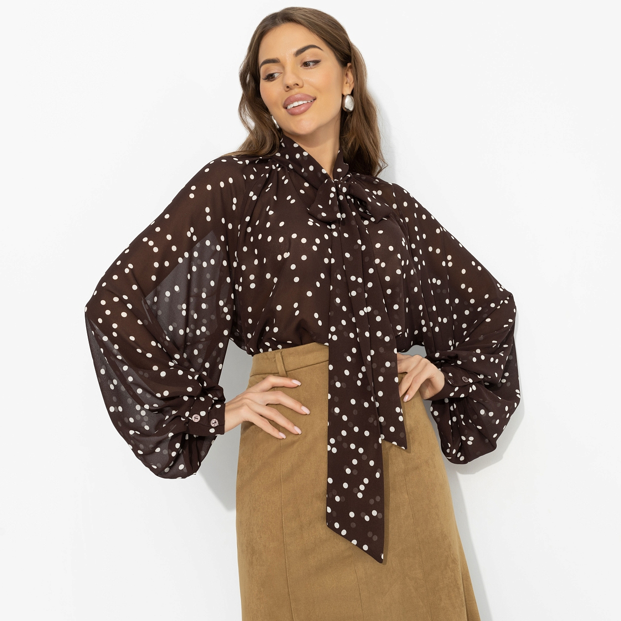 Ложка разрезает тирамису – слой за слоем открывается глубина вкуса: крепкий американо, нежный крем, горький шоколад. Тот самый баланс сладости и характера. В этом образе есть почти что гастрономическая интрига: лёгкость, которая манит, и глубина, которую хочется разгадывать. Блуза из воздушного шифона создаёт пластичный, невесомый силуэт. Полупрозрачная фактура красиво играет в движении. Послевкусие, к которому хочется возвращаться.