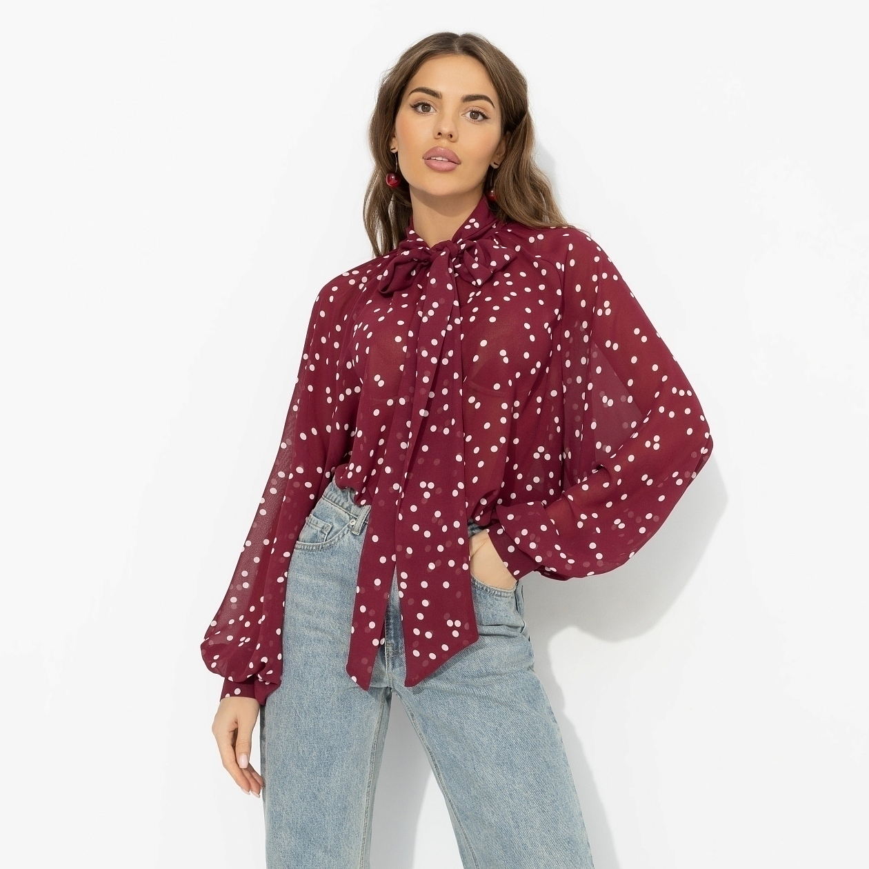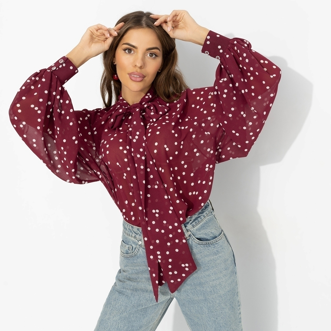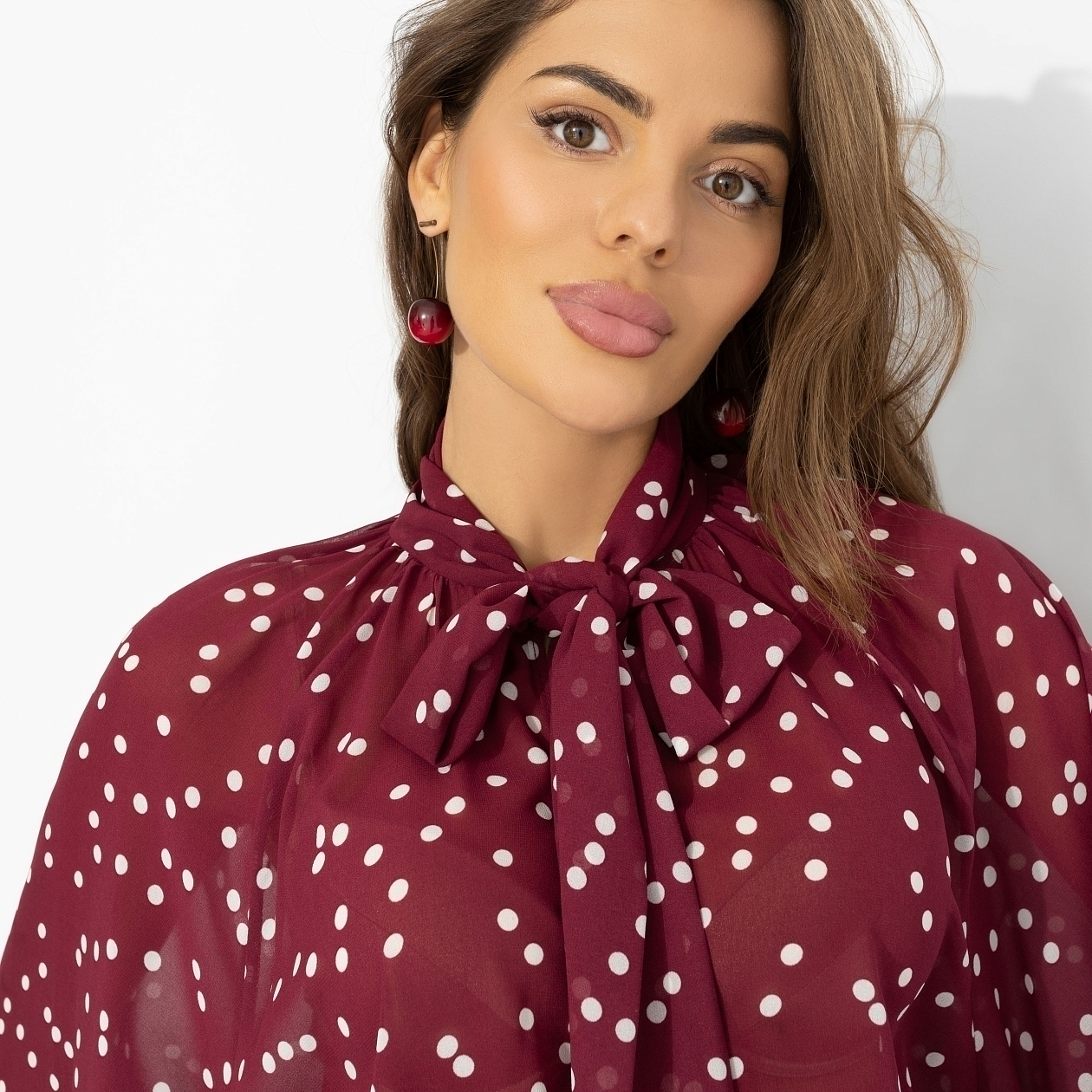 Солнце опустилось низко, пыльная дорога тянется за горизонт, ветер развевает волосы – и ты будто героиня стильного вестерна. Взгляд уверенный, шаг свободный, настроение – ловить удачу за хвост. Бордовый оттенок звучит глубоко и дерзко, как история о красотке, которая любила играть по своим правилам. Блуза ЧАРУТТИ из лёгкого шифона смотрится живо, воздушно. Объёмные рукава добавляют драматичности, завязки формируют выразительный акцент. Модель идеально сочетается с денимом. Стиль, который точно привлечет удачу на твою сторону.
