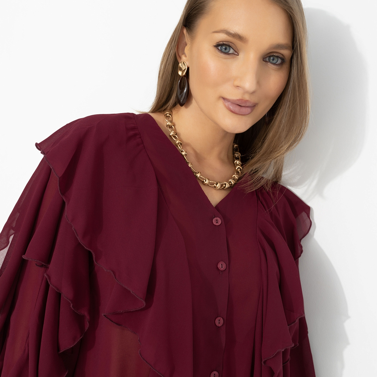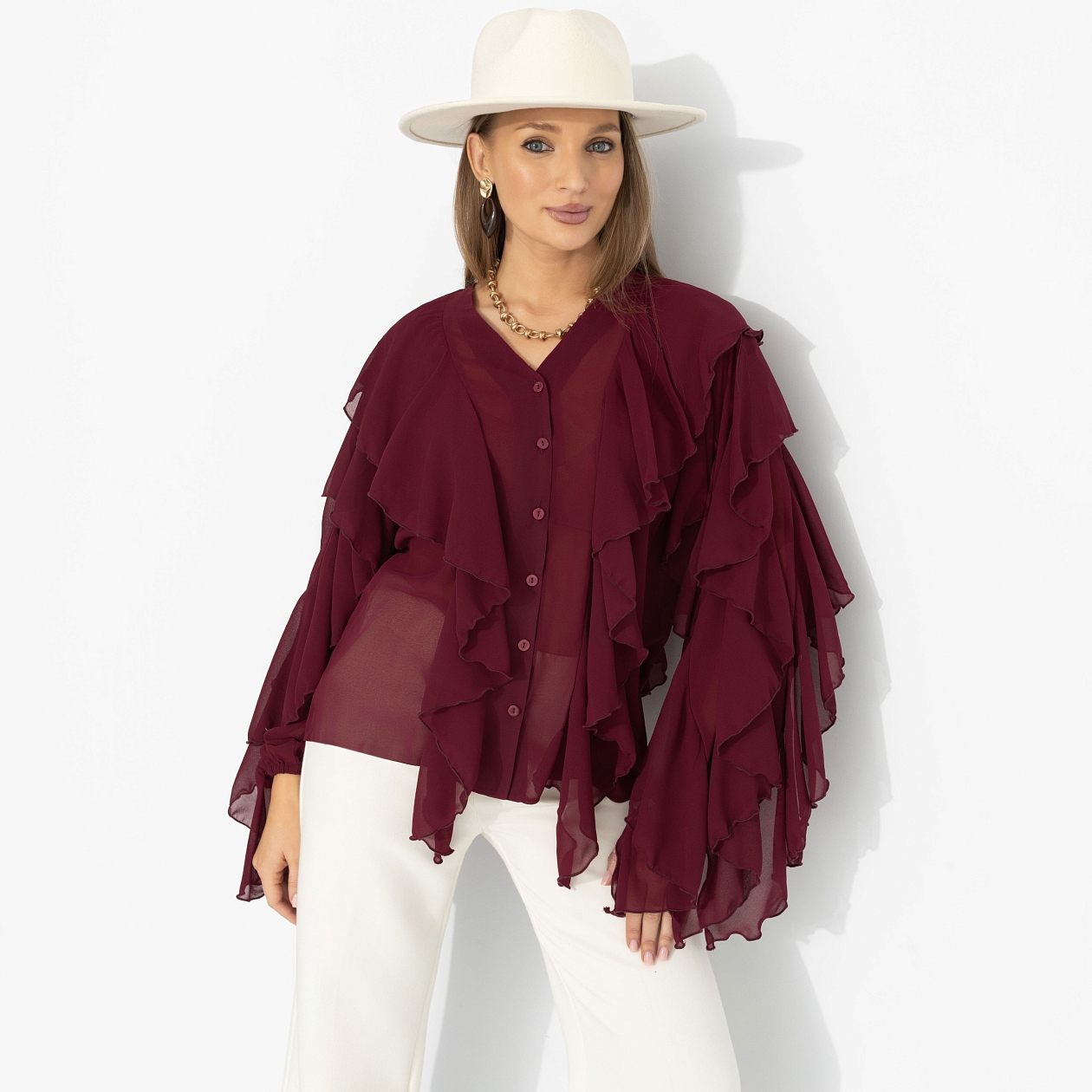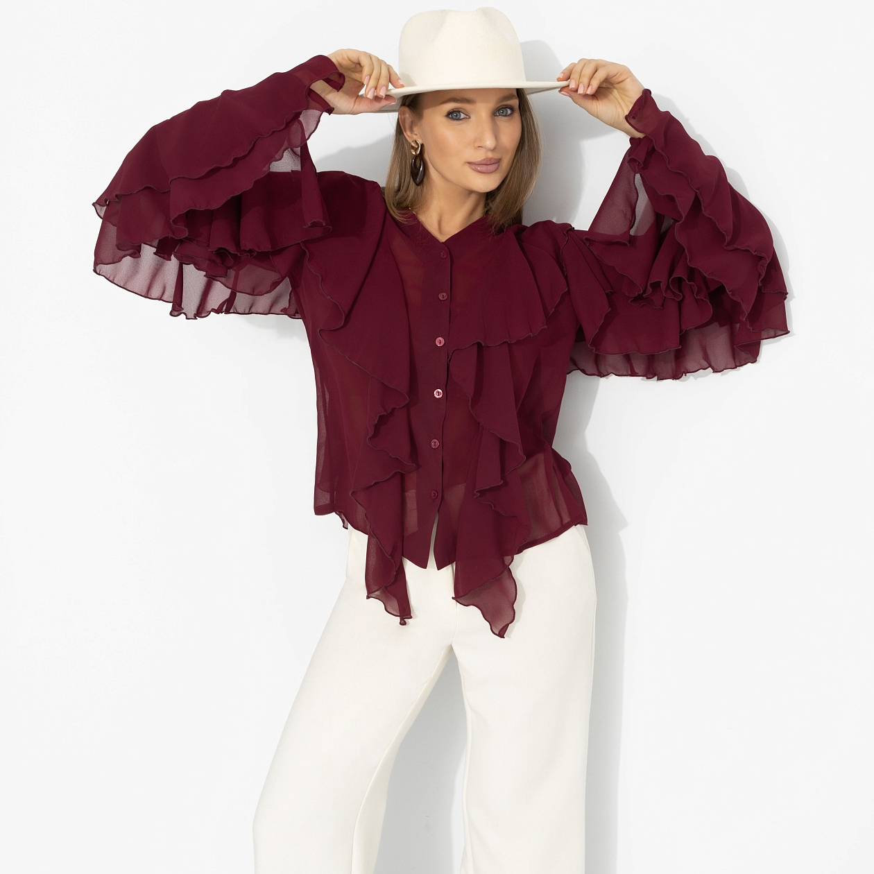 Представь: ты выходишь из особняка на берегу Босфора – и ветер играет рукавами твоей блузы, как в лучших сценах турецких сериалов. Глубокий винный оттенок звучит страстно, шифон струится и создаёт воздушный эффект, многослойные воланы двигаются в такт каждому шагу. Это не просто образ – а момент, когда в одном кадре роскошь и стиль.