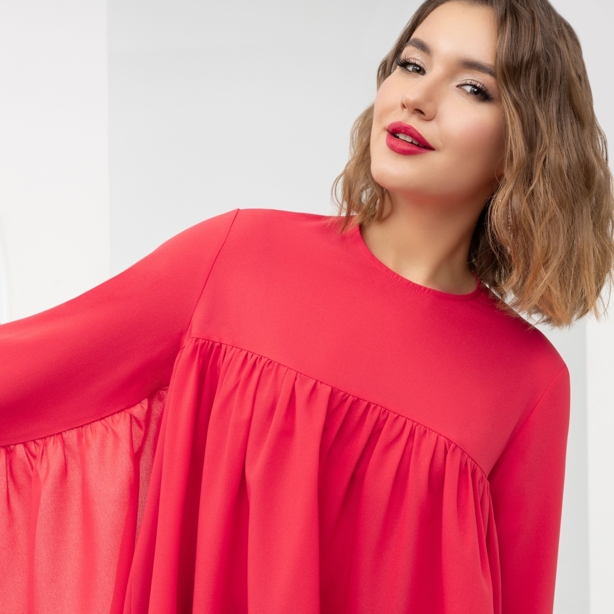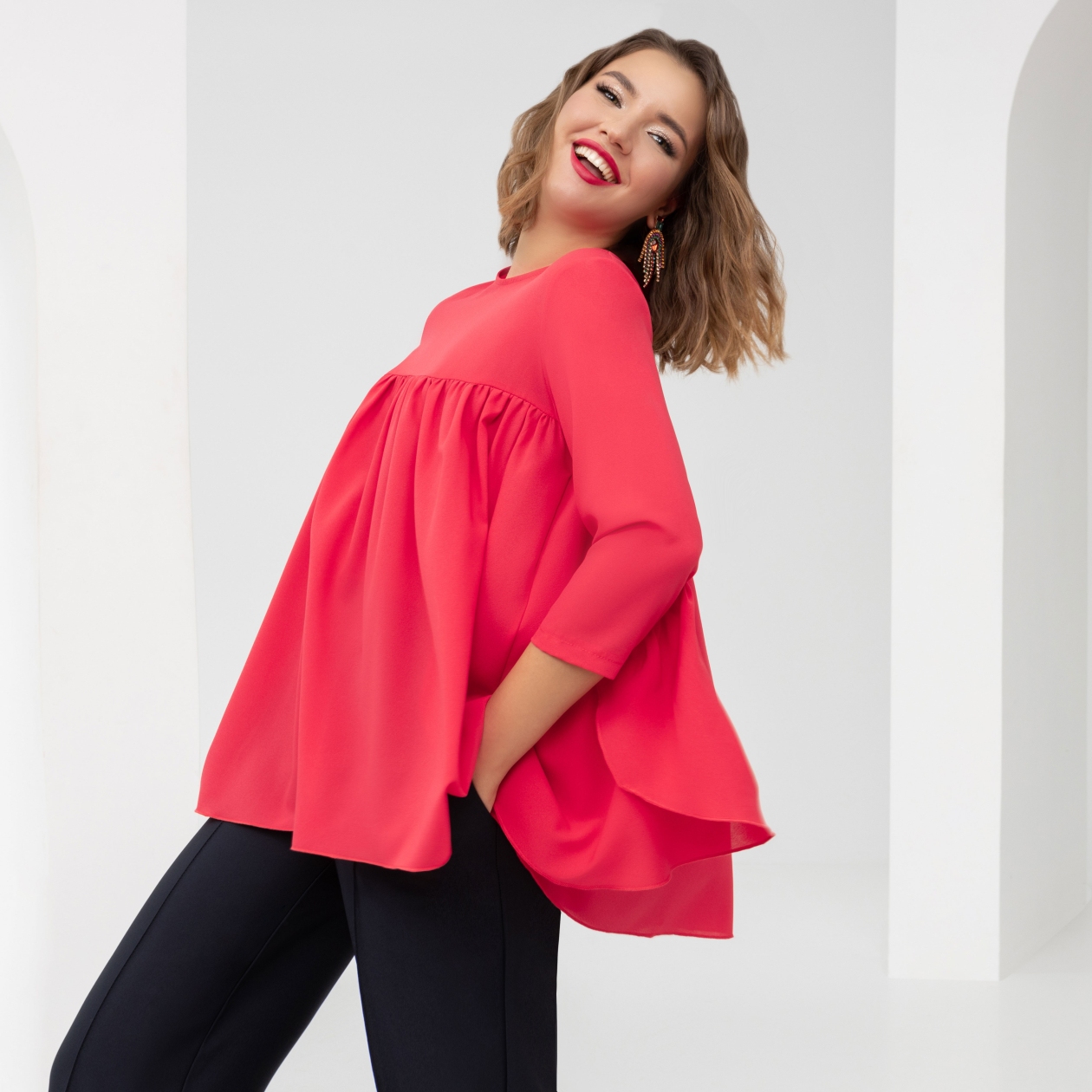 Игривая блуза с летящим силуэтом. Легкие волны ткани ласково обнимают фигуру. Яркий цвет поднимает настроение. С этой блузой каждый день будет проходить весело. Для вас и окружающих. Примерь счастье уже сегодня!