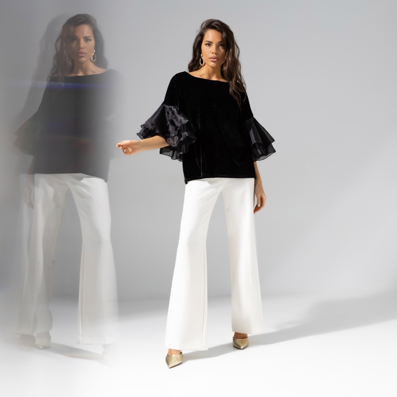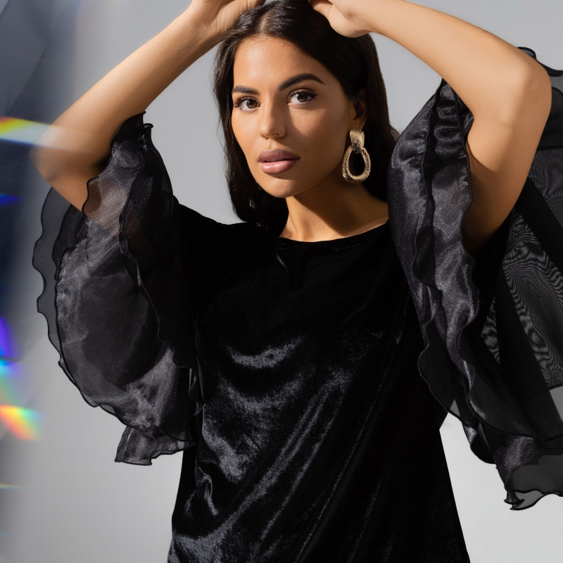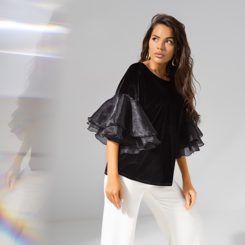 Ты получила внезапное приглашение на вечернюю презентацию уже в разгар рабочего дня. И в очередной раз поблагодарила себя за грамотно составленный гардероб и fashion-интуицию. Ты в блузе с объемными рукавами. А значит, можешь пойти на вечеринку. Не нужно переодеваться. Блуза свободного кроя из бархата, удлиненная. Спущенная линия рукава. Рукав украшен объемным многослойным декором из органзы. Блуза хорошо смотрится в заправленном виде и навыпуск.