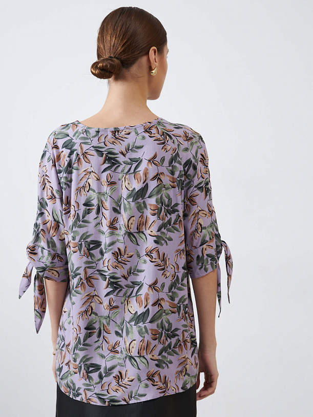 Блуза с привлекательным растительным принтом выполнена из 100% вискозы. Этот стильный элемент гардероба дополнен завязками на рукавах, которые добавляют нотку изысканности. Блузу можно носить ее как в расправленном виде для свободного и легкого образа, так и заправленной для более строгого и элегантного стиля.