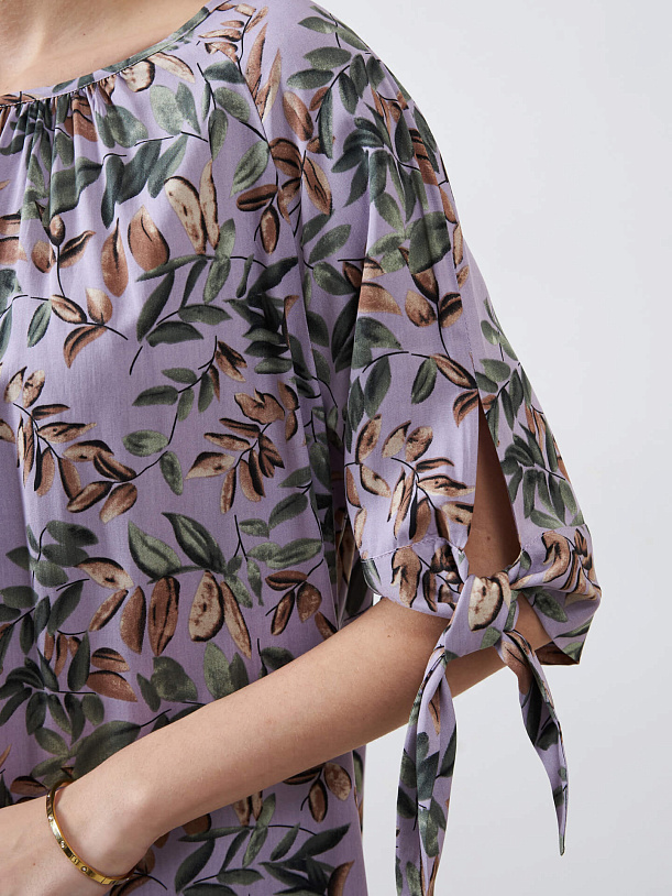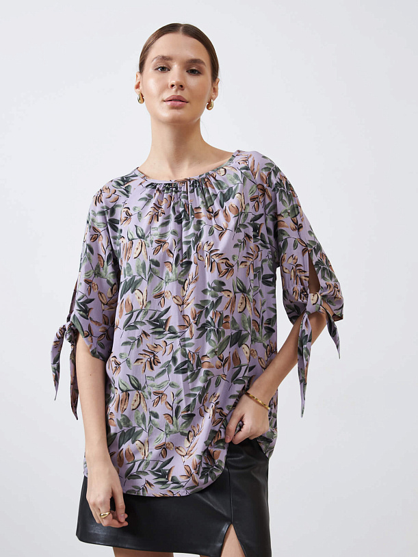 Блуза с привлекательным растительным принтом выполнена из 100% вискозы. Этот стильный элемент гардероба дополнен завязками на рукавах, которые добавляют нотку изысканности. Блузу можно носить ее как в расправленном виде для свободного и легкого образа, так и заправленной для более строгого и элегантного стиля.