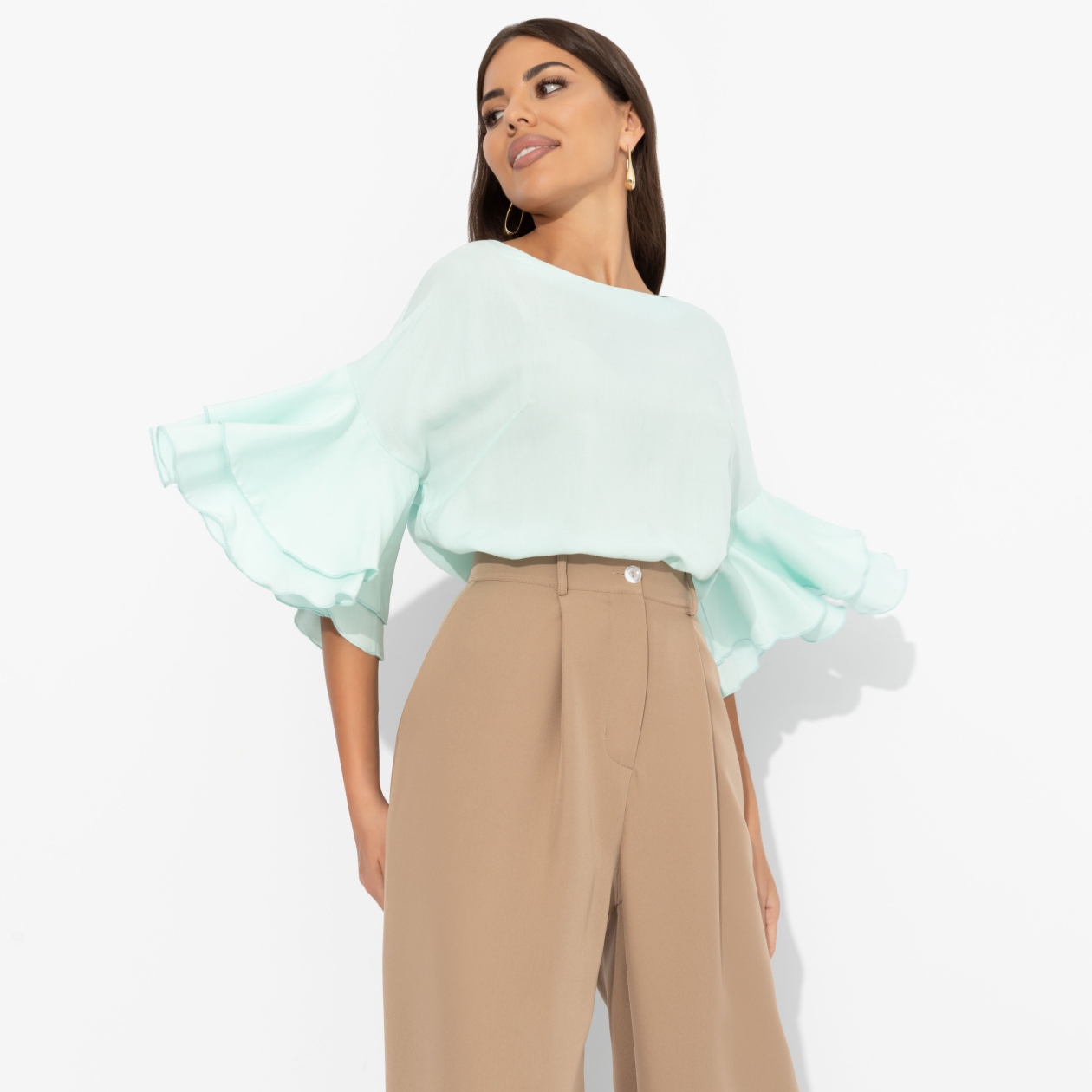 А знали ли вы, что мятный вкус оказывает воздействие на нервные окончания, подавляя чувство беспокойства? Аналогичный эффект у мятного цвета. Проверяйте в блузе ЧАРУТТИ. Блуза прямого кроя. Спущенная линия плеча. Объемные рукава декорированы двумя слоями рюш. Блуза хорошо смотрится в заправленном виде и навыпуск.