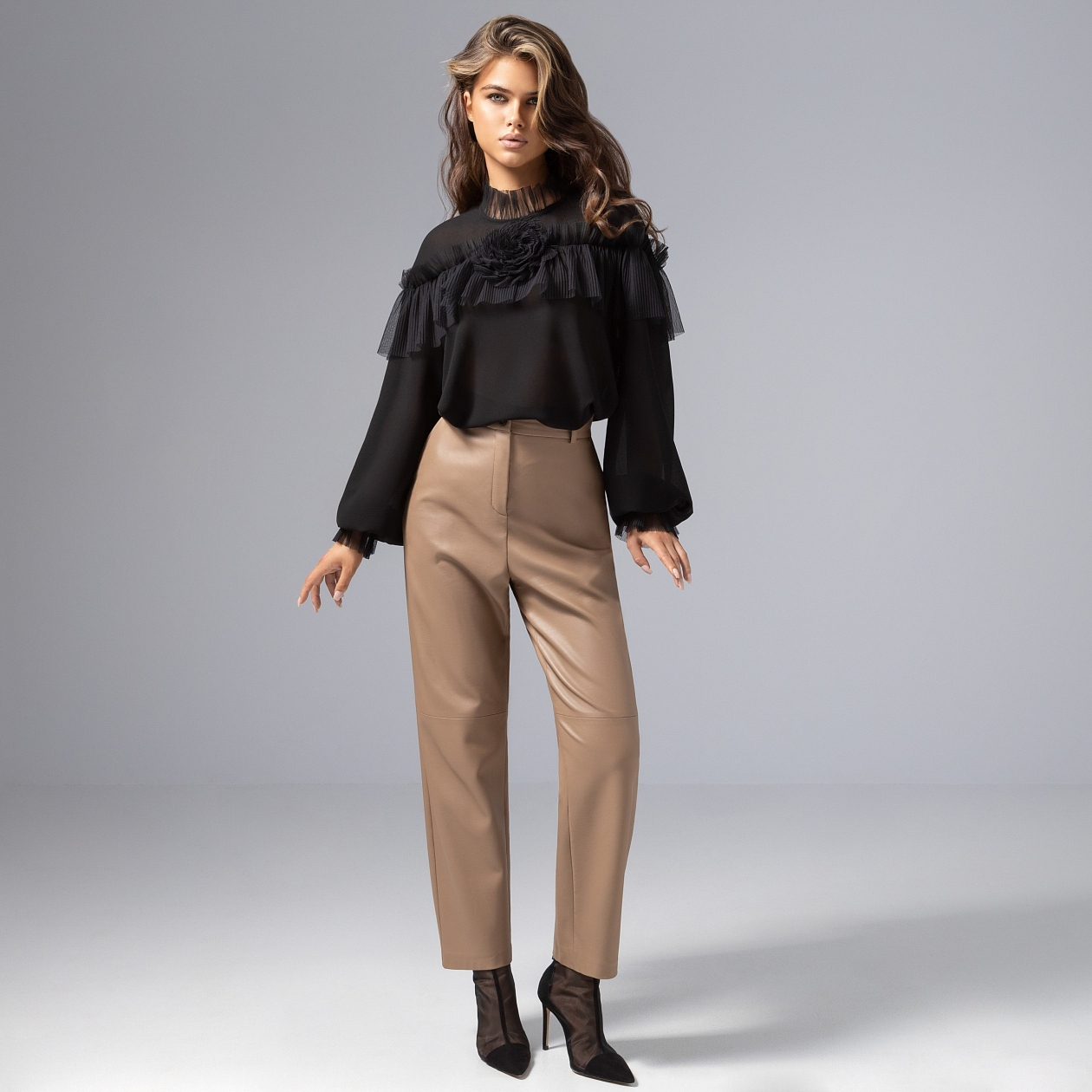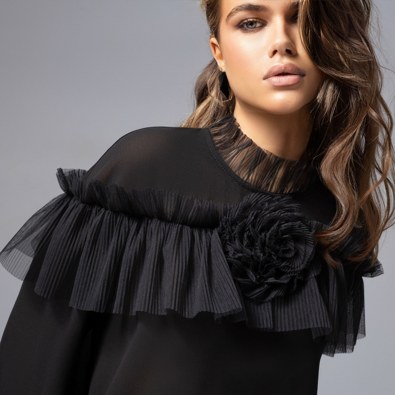 Её появление всегда вызывало легкое напряжение в воздухе. Однажды она просто вошла – в черной блузе ЧАРУТТИ, с роскошным декором и волной прозрачной сетки на плечах. В её глазах – притяжение, в походке – обещание приключений. Роковая красота не требует лишних слов. Сегодня – она сама диктует правила игры. Блуза свободного кроя из шифона с притягтельной текстурой. Для тех, кто выбирает стиль с характером и любит становиться поводом для восторгов.
