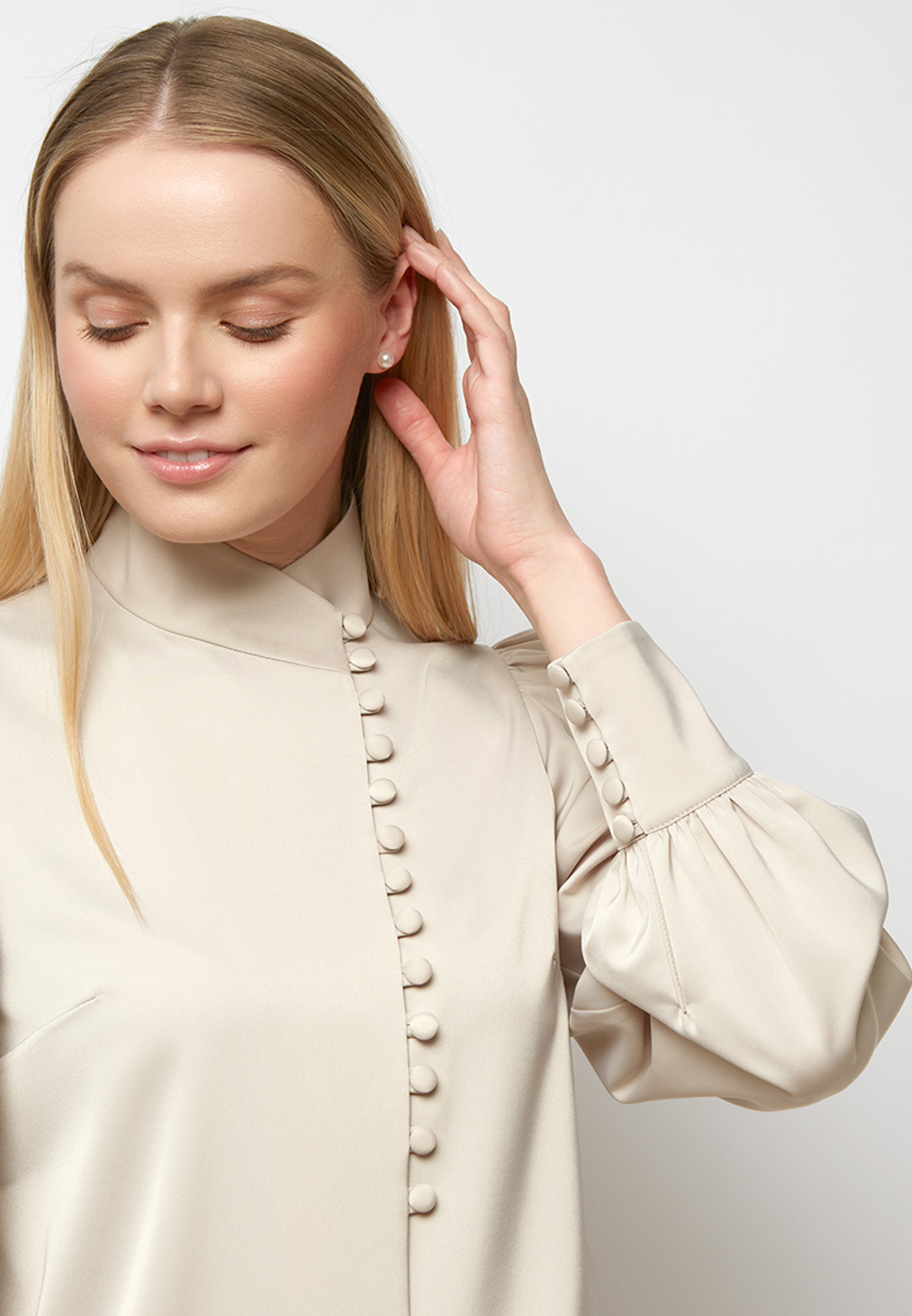 Блуза-косоворотка прямого силуэта с длинным рукавом на высокой манжете из плотной блузочной ткани. Воротник и манжеты изделия украшены большим количеством воздушных петель и мелких пуговиц,окрашенных в тон ткани. Рост модели 172 см. Блузка на модели 42-го размера. Машинная деликатная стирка.