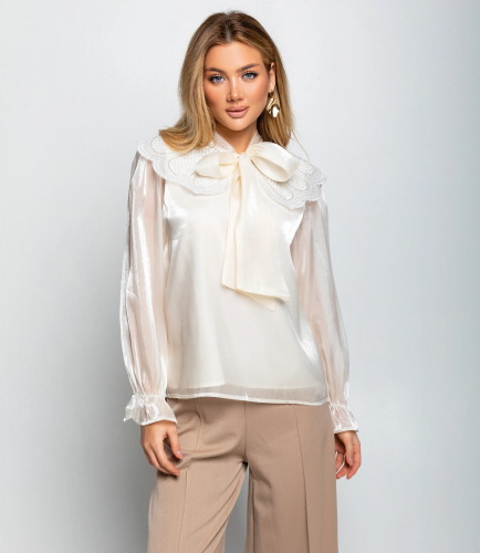 Эта Блуза — идеальный выбор для вашего магазина, предлагающий стильный и универсальный элемент гардероба для весеннего сезона. Лёгкая блуза прямого силуэта длиной до бёдер выполнена из тонкой полупрозрачной ткани с мягким блеском и плавным драпированием; широкий плоский воротник с волнообразным краем плавно переходит в длинные завязывающиеся ленты, образующие бантик на шее; длинные рукава имеют небольшой объём в верхней части и заканчиваются узкими присборенными манжетами с тонкой оборкой; воротник украшен деликатной отделочной строчкой или вышивкой вдоль края. Ткань из 100% полиэстера является качественной и приятной на ощупь, а свободный крой обеспечивает комфорт при носке, позволяя чувствовать себя уверенно в течение всего дня. Эта Блуза станет универсальным элементом гардероба, который легко сочетать как с брюками для создания делового образа, так и с джинсами для более повседневного и расслабленного стиля. На странице сайта доступна таблица размеров, что поможет вашим покупателям быстро найти идеальный вариант. Предложенная цена делает ее доступной для широкой аудитории, что повышает интерес к этой модели.