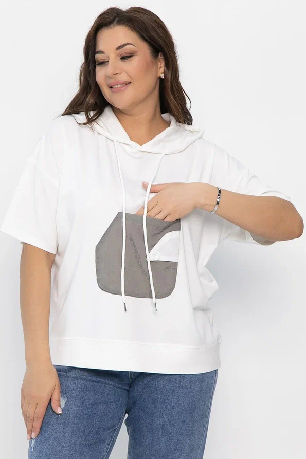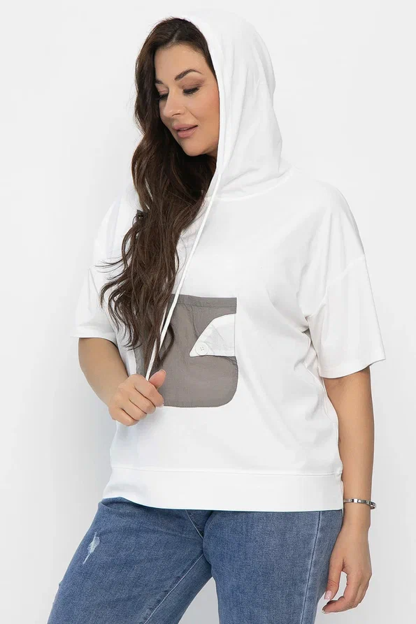 Блуза свободного кроя с капюшоном — это модель, которая сочетает в себе комфорт и практичность. Она станет отличным выбором как для повседневного образа, так и для активного отдыха на природе. Свободный крой и спущенный рукав придают образу непринуждённый и свободный вид. Функциональный карман по переду украшен пуговицей, что придает образу оригинальности.