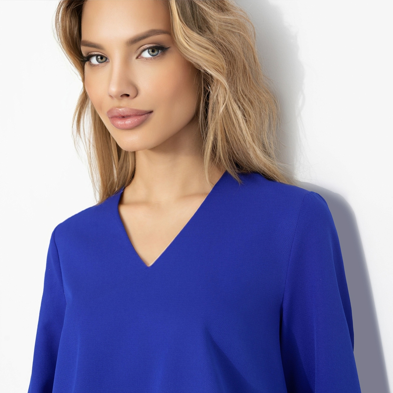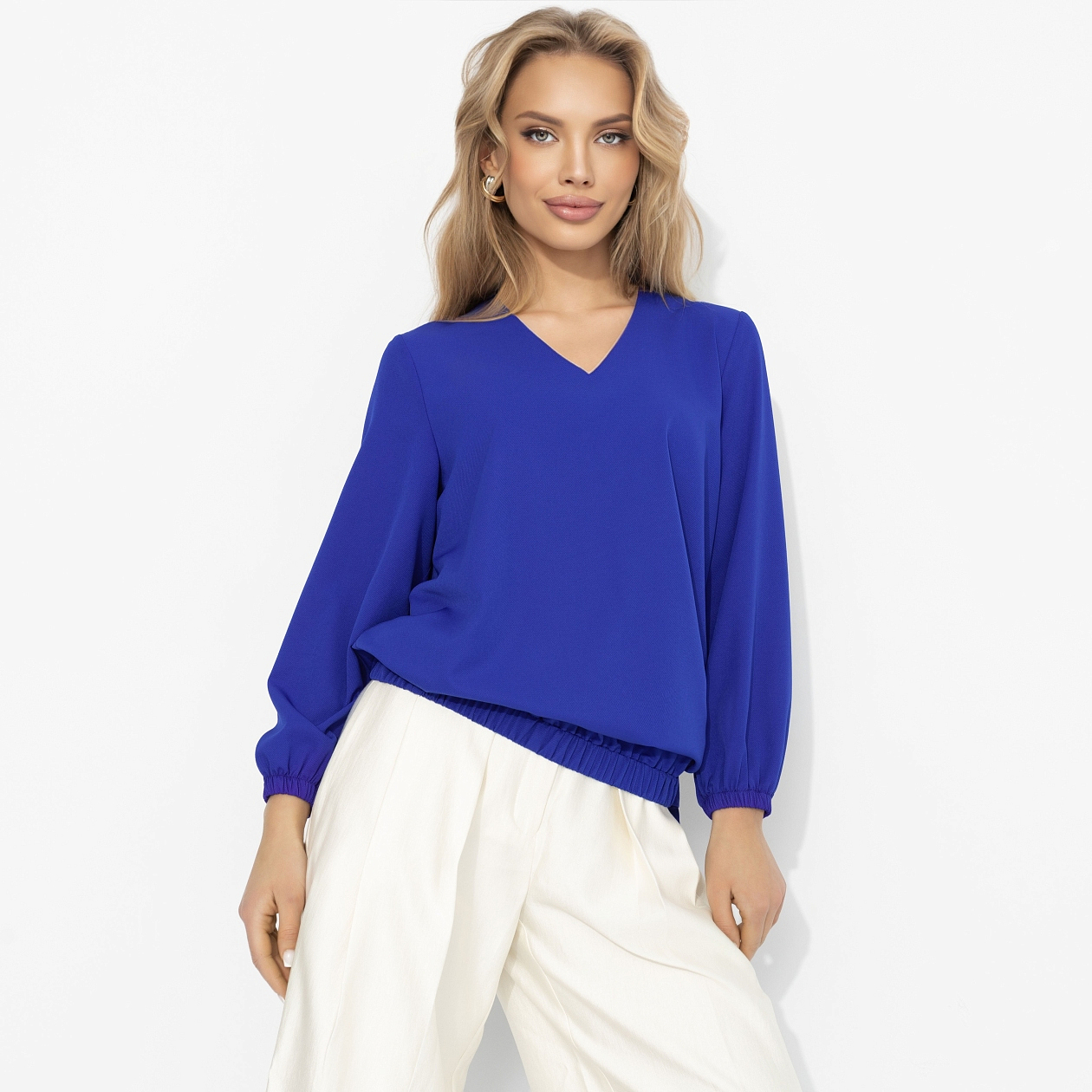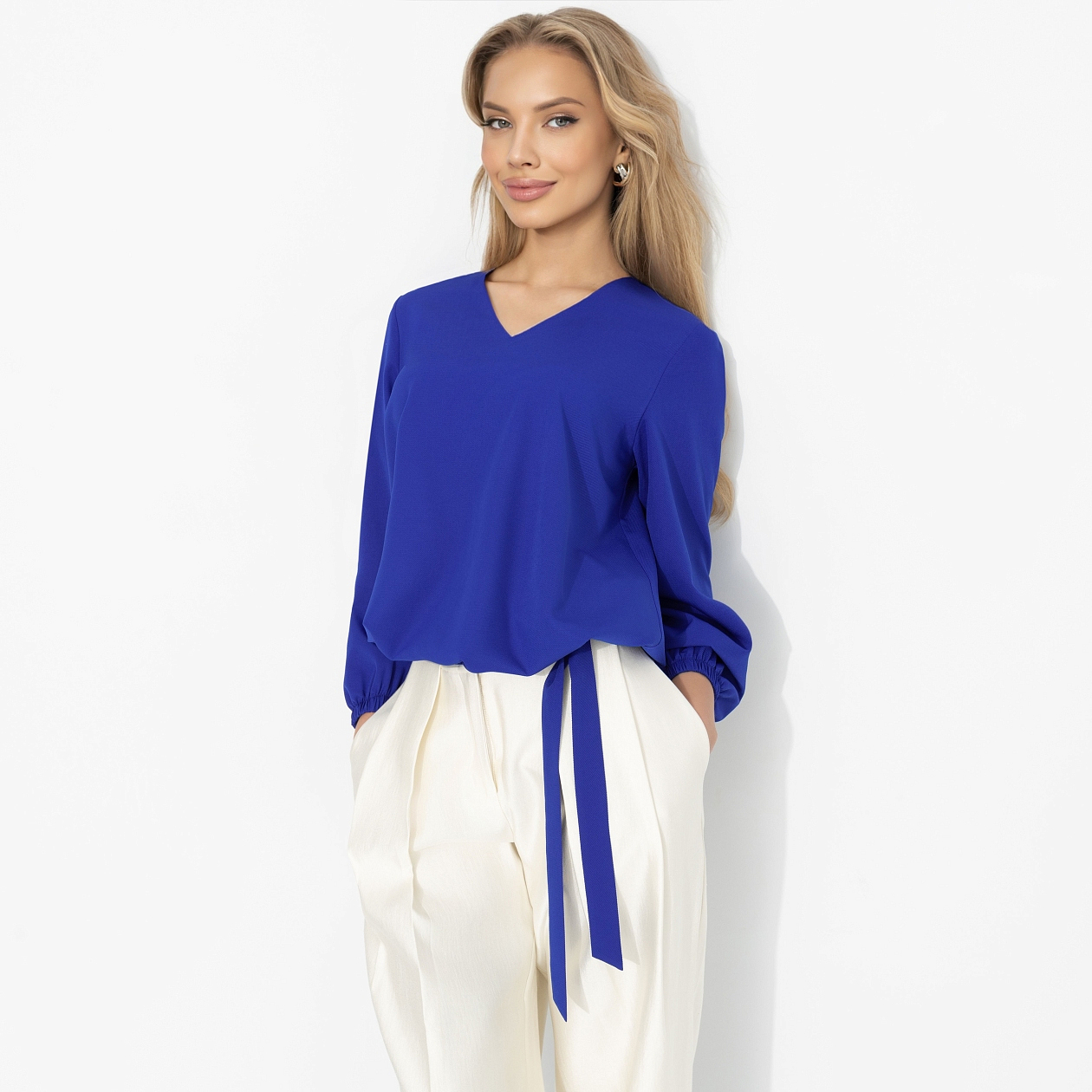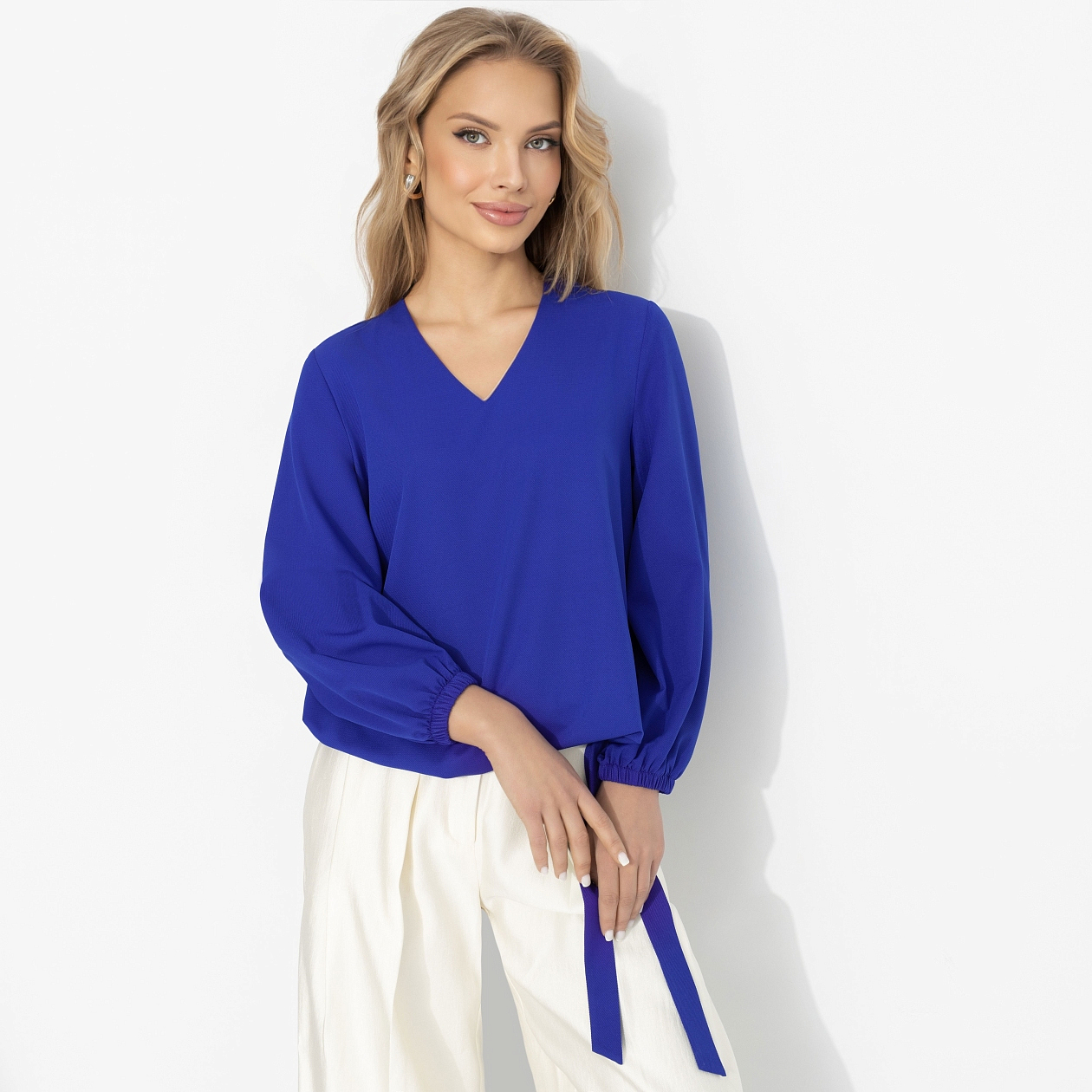 Щёлк – моментальня вспышка. Как будто где-то щёлкнул рубильник, и весна включилась. Этот электрический синий бьёт точно в цель: тебя заметит каждый. Глубокий V-вырез вытягивает силуэт, мягкие рукава добавляют пластики, твил красиво держит форму и струится при движении. Гладкая и комфортная ткань дарит тебе ультраженственность. Он просто посмотрел – и уже весь твой. Блуза оформлена резинкой по нижнему краю и завязками.