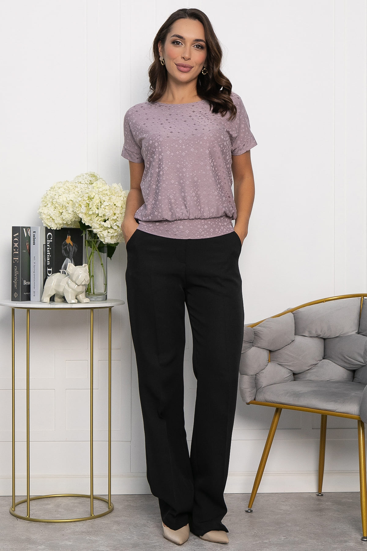 Встречайте изысканную блузку в светло-сиреневом оттенке. Этот элемент гардероба станет вашим универсальным спутником. Свободный крой обеспечивает удобство и свободу движений, а круглый вырез добавляет образу элегантности. Спущенный рукав с притачной манжетой придает модели особый шарм. Низ блузы на широкой ножке.