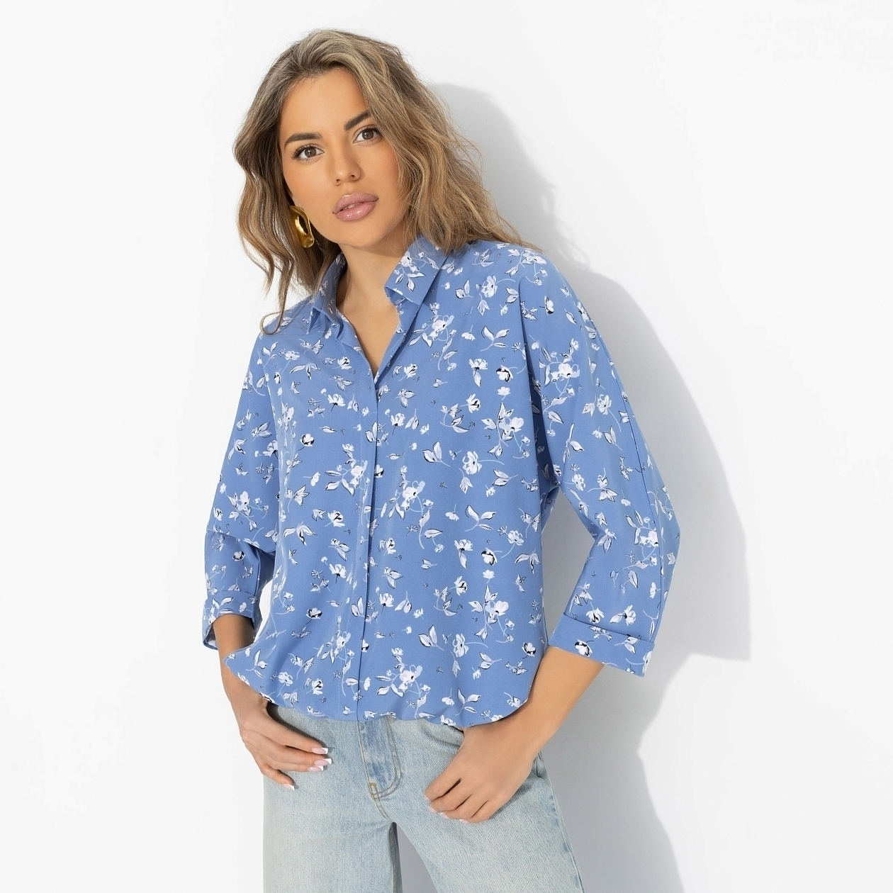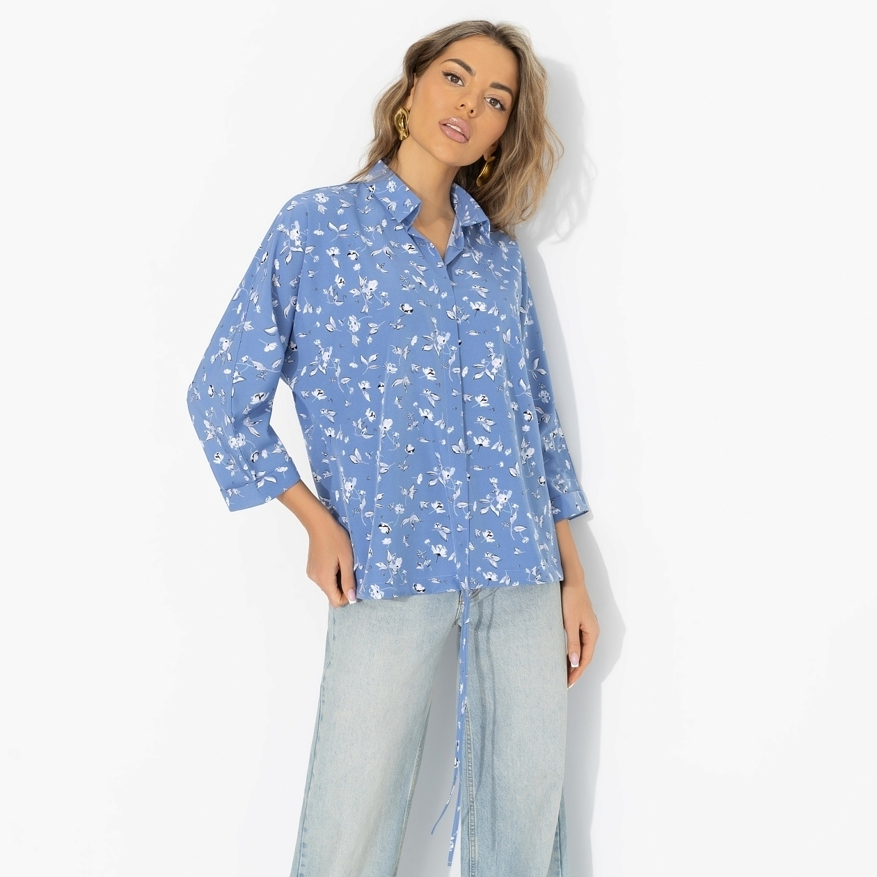Что надеть, когда ещё не решила, каким будет твой день? Выходишь за кофе в новой блузке, ловишь своё отражение в стекле и понимаешь: я выгляжу идеально. Небесный цвет подсвечивает лицо, принт добавляет динамичности и создает ощущение «я только из отпуска», хотя ты просто надела блузу и джинсы. Лёгкая ткань «ниагара» красиво струится и не утяжеляет силуэт. Кулиска по нижнему краю позволяет носить блузу несколькими способами – под разные сценарии дня.