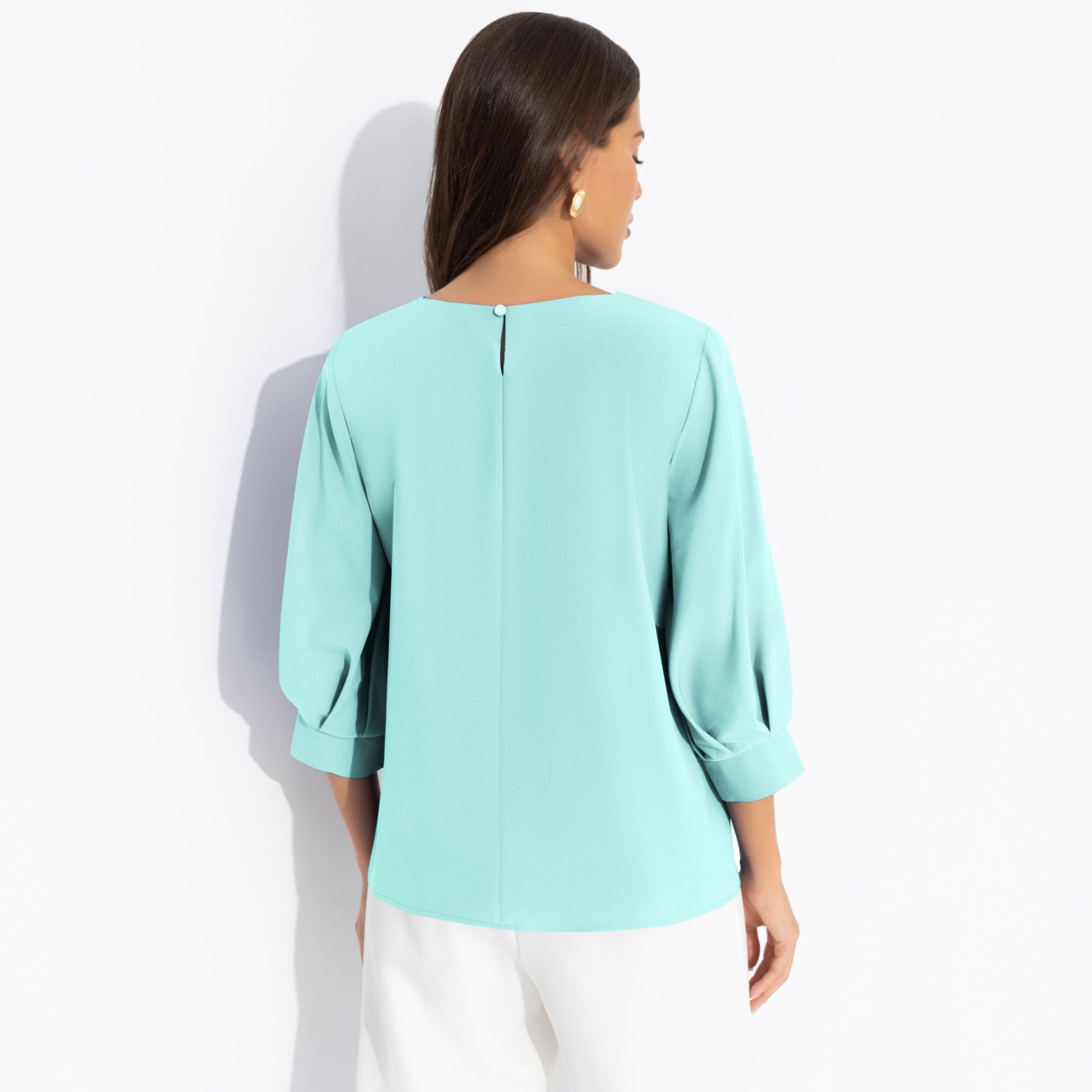 Блуза цвета Тиффани – это идеальное решение для пятницы в офисе, когда хочется ощутить дыхание выходных, не нарушая рабочий ритм. Её сочный, но благородный оттенок действует как визуальный антистресс, поднимая настроение вам и вашим коллегам. Элегантный крой и благородная ткань делают её уместной для деловой среды, одновременно позволяя вам мягко сиять. Блуза прямого кроя с защипами на рукавах. Изделие хорошо смотрится в заправленном виде и навыпуск. Деликатная застежка по спинке изделия.