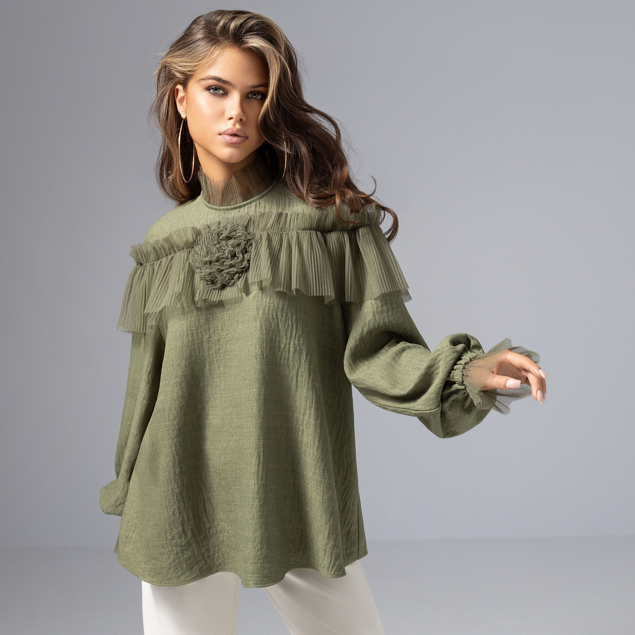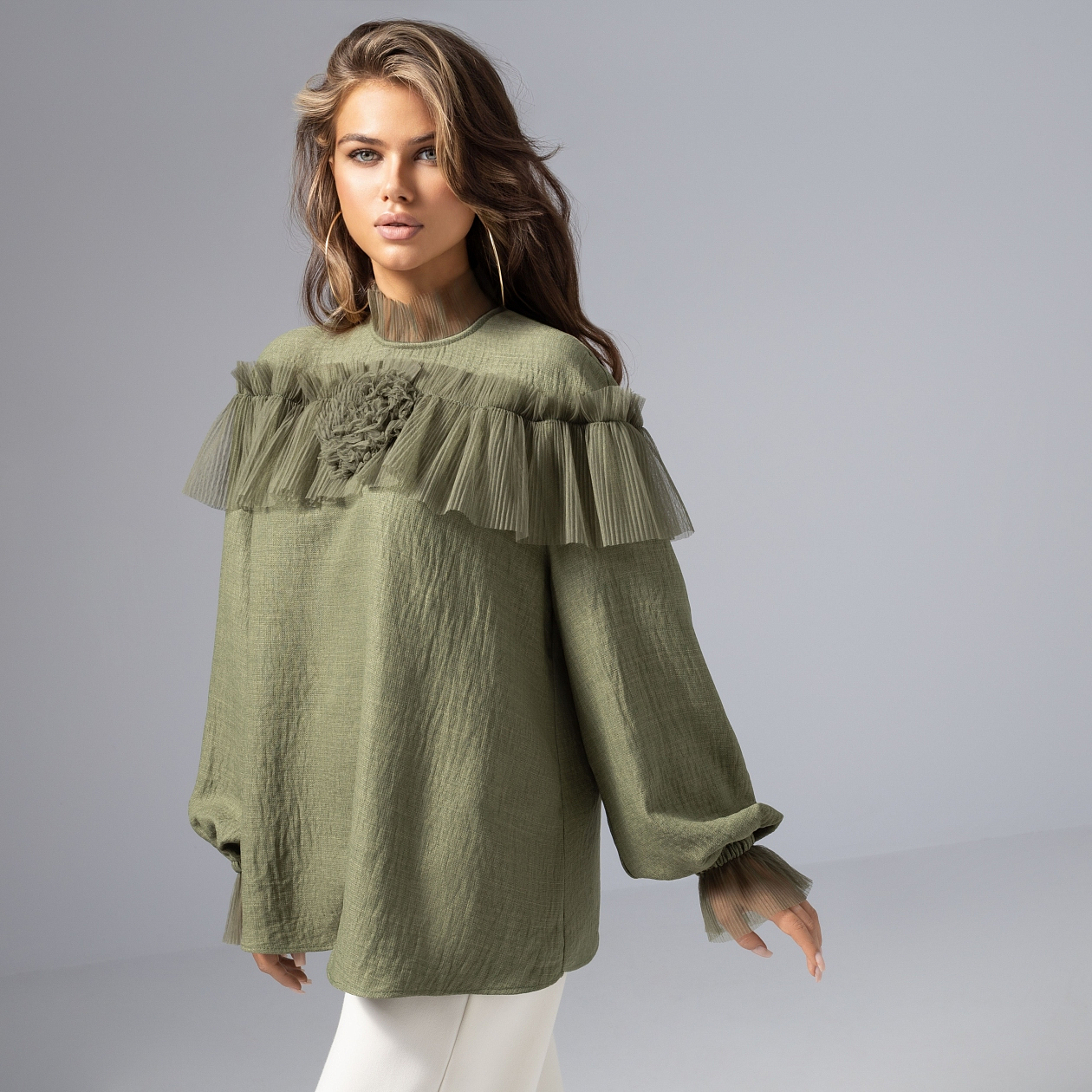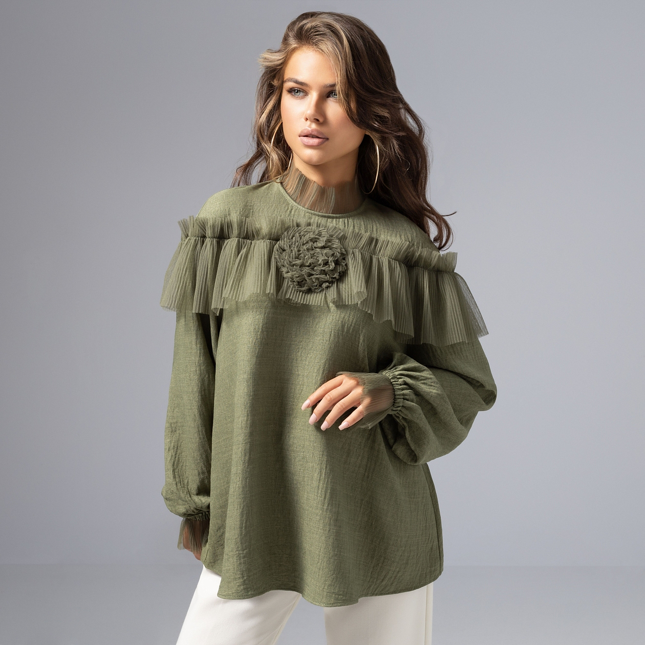 В этой блузе ЧАРУТТИ так легко почувствовать себя лесной нимфой или загадочной дриадой. Мягкая зелень, легкая сетка-гофре, прозрачные волны ткани – словно дуновение ветра в тени волшебных деревьев. Создайте вокруг себя красивую сказку! Эффектная сетка и объемная роза – идеальная комбинация для романтического образа. Свободный крой дарит внутреннюю свободу, полупрозрачные манжеты и ворот делают твой аутфит по-настоящему изысканным.