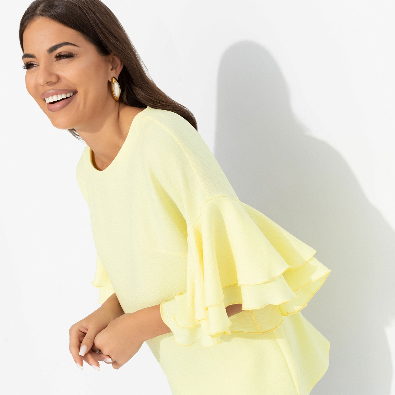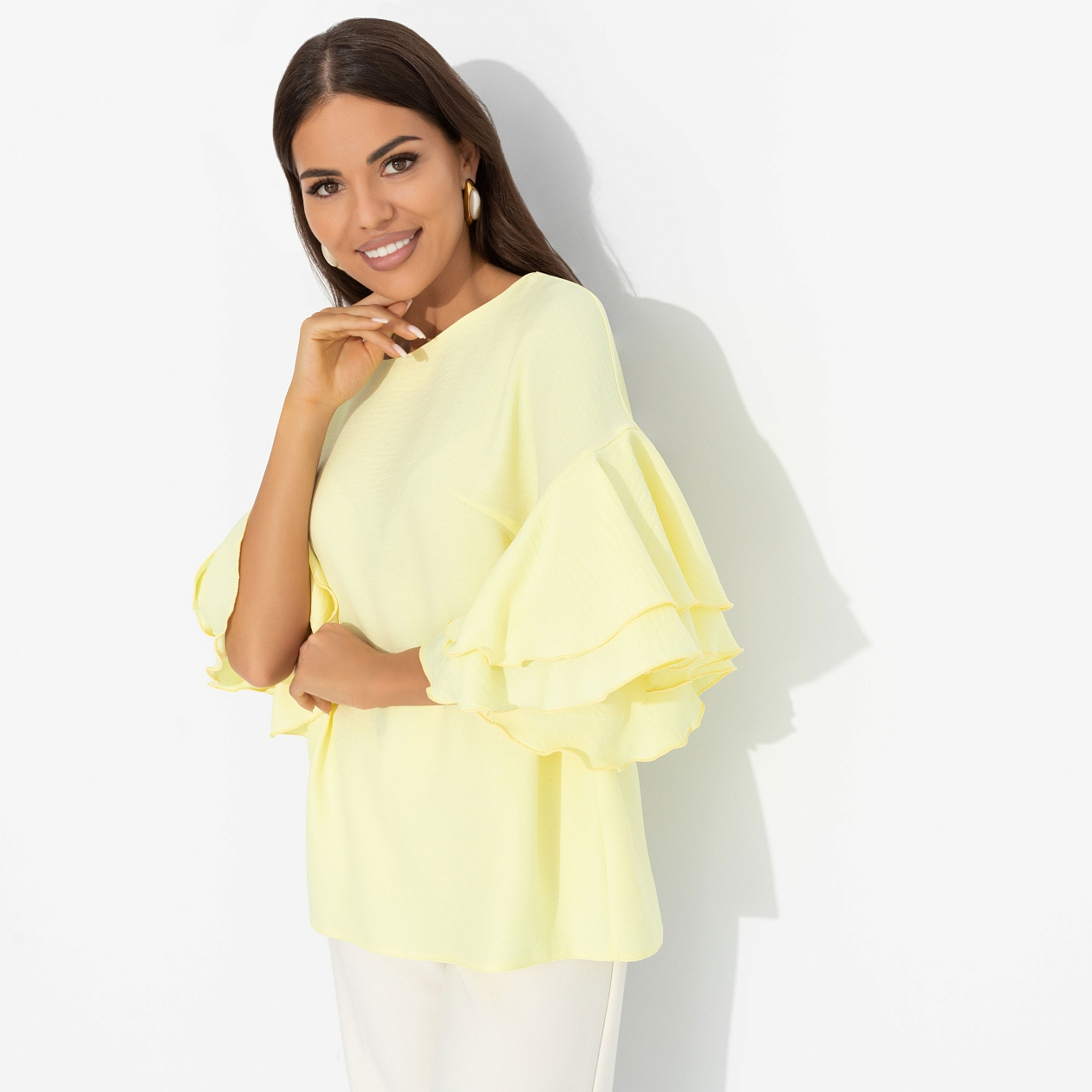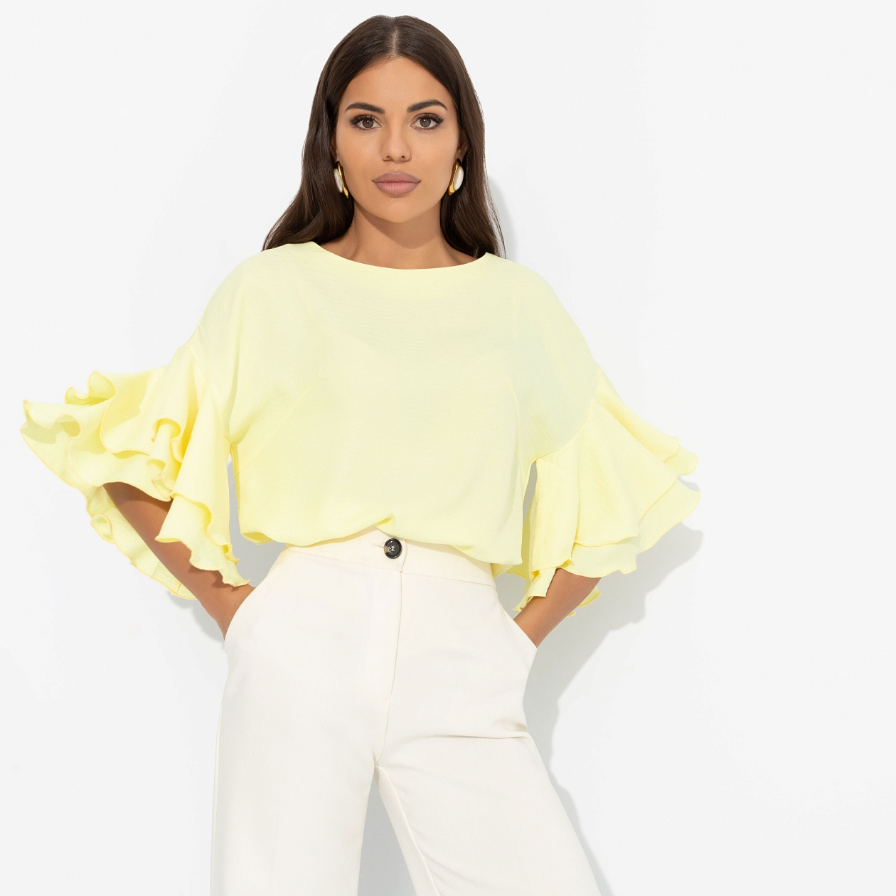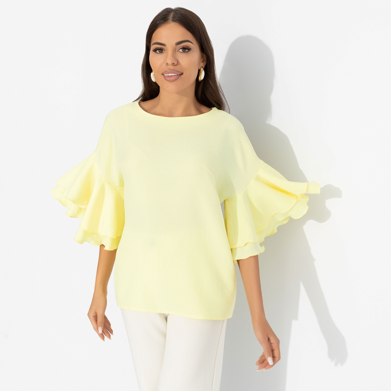 В блузе ЧАРУТТИ ваша энергия обнажается. Бьет ключом и светит ярко, обеспечивая молниеносную влюбленность всем вокруг. Магия притяжения в нежном лимонном цвете. Блуза прямого кроя. Спущенная линия плеча. Объемные рукава декорированы двумя слоями рюш. Блуза хорошо смотрится в заправленном виде и навыпуск.