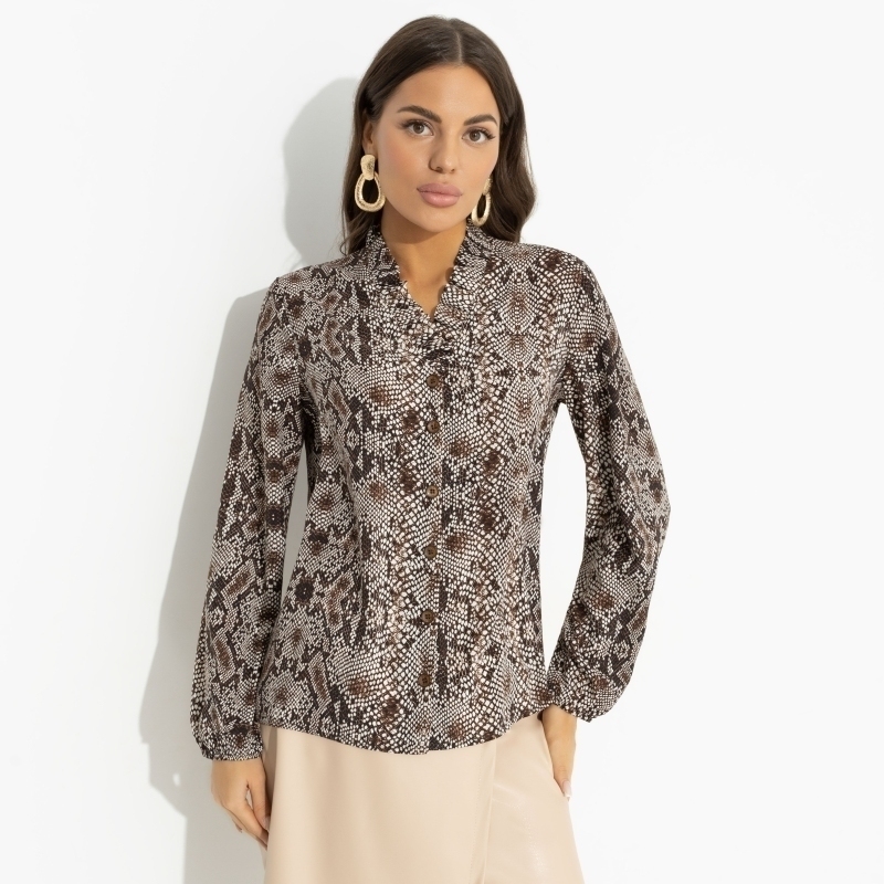 Из всех представителей фауны ты бы все равно выбрала её. Грациозная, ловкая, мудрая и решительная. Носить змеиный окрас не только почетно, но и ультрамодно. Будь собой и будь в тренде. Блуза классического кроя. V-образный вырез оформлен деликатными рюшами. Блуза застегивается на пуговицы по передней части изделия. Хорошо смотрится в заправленном виде и навыпуск.