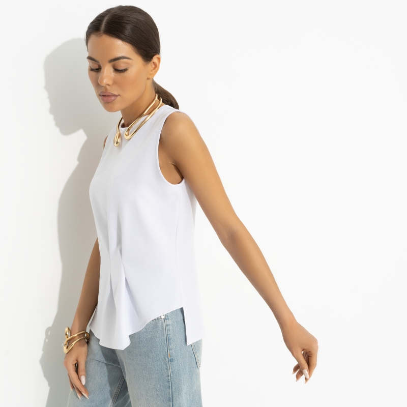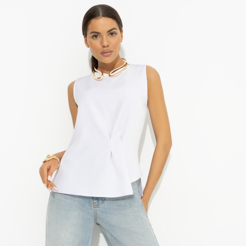 Погода: становится на два градуса теплее. Я: уже в блузе CHARUTTI без рукавов. Идеальный вариант для повседневных образов. Миксуйте с разными низами и с яркими аксессуарами. Блуза без рукавов с декоративными акцентными защипами. Две объемные пуговицы по спинке изделия.